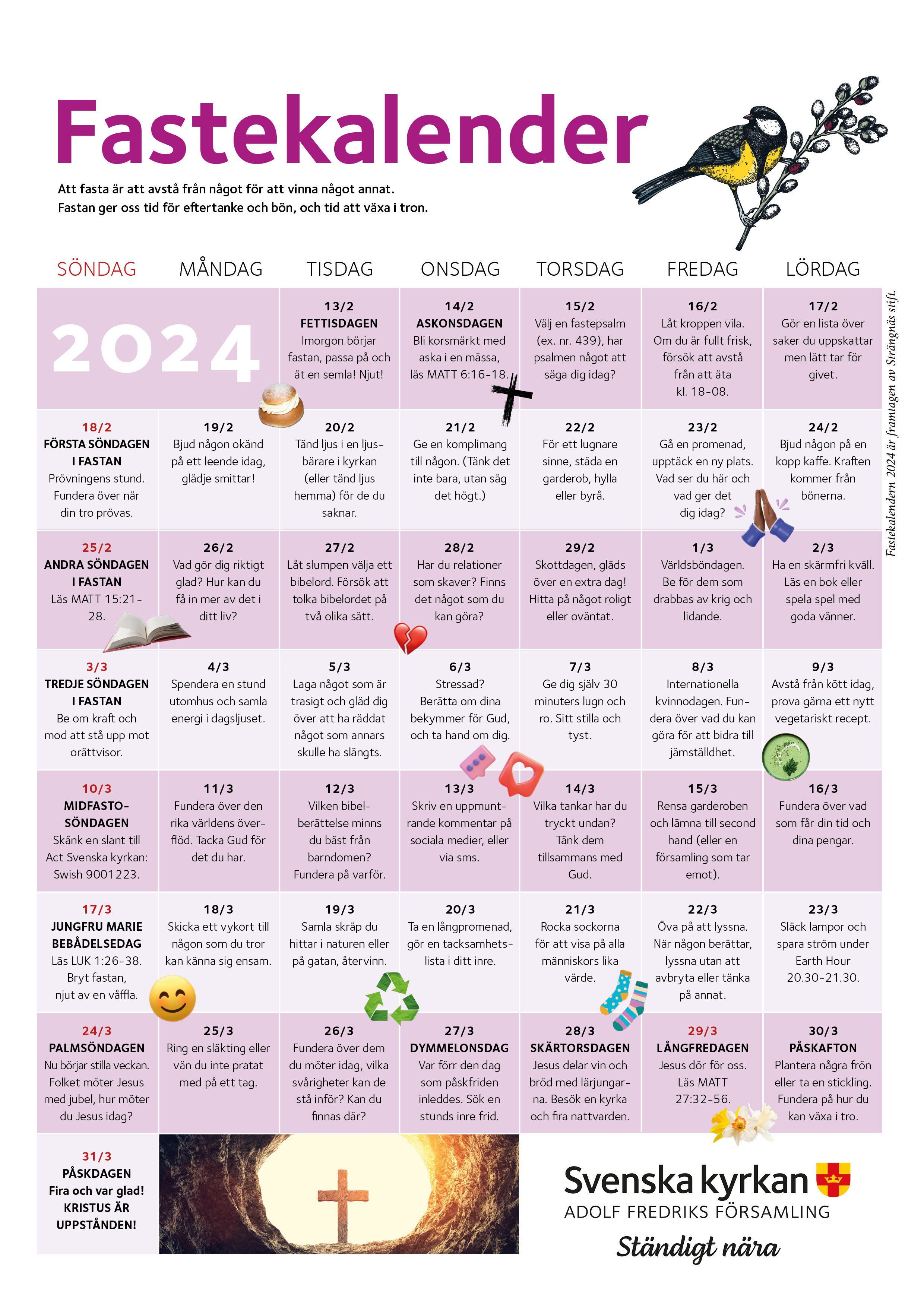I den här kalendern får du tips om saker du kan tänka på och göra under fastetiden.