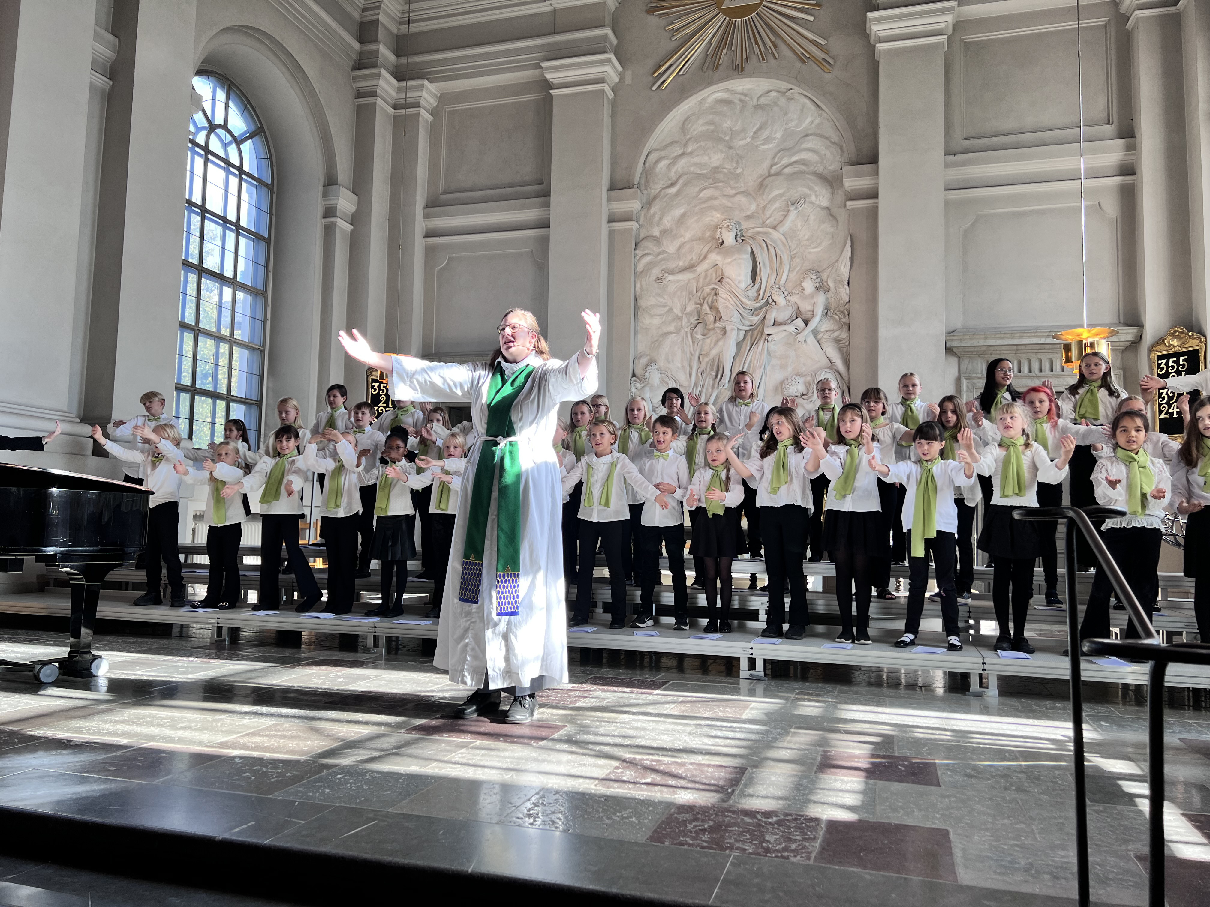 Körbarnen är med i gudstjänsten och sjunger sånger som handlar om temat för dagen. I gudstjänsten får vi tillsammans samlas och lyssna, sjunga, be och dela nattvard. När vi firar nattvard är alla som vill välkomna att ta emot bröd och vin. Barnen som sjunger i körerna går till ”sin vuxna” som är med i kyrkan och tar med denna till nattvardsutdelandet. Man får ett bröd i handen och kan sedan doppa det i det alkoholfria vinet och sen äta. Nattvarden är åminnelsen av Jesus. Han sa att vi ska dela bröd och vin och på så sätt minnas vem Jesus och Gud är. I kyrkan tror vi att brödet och vinet också är Jesus kropp och blod som vi äter. Vill ni veta mer om det - fråga någon av församlingens anställda vid Mässa för alla åldrar.