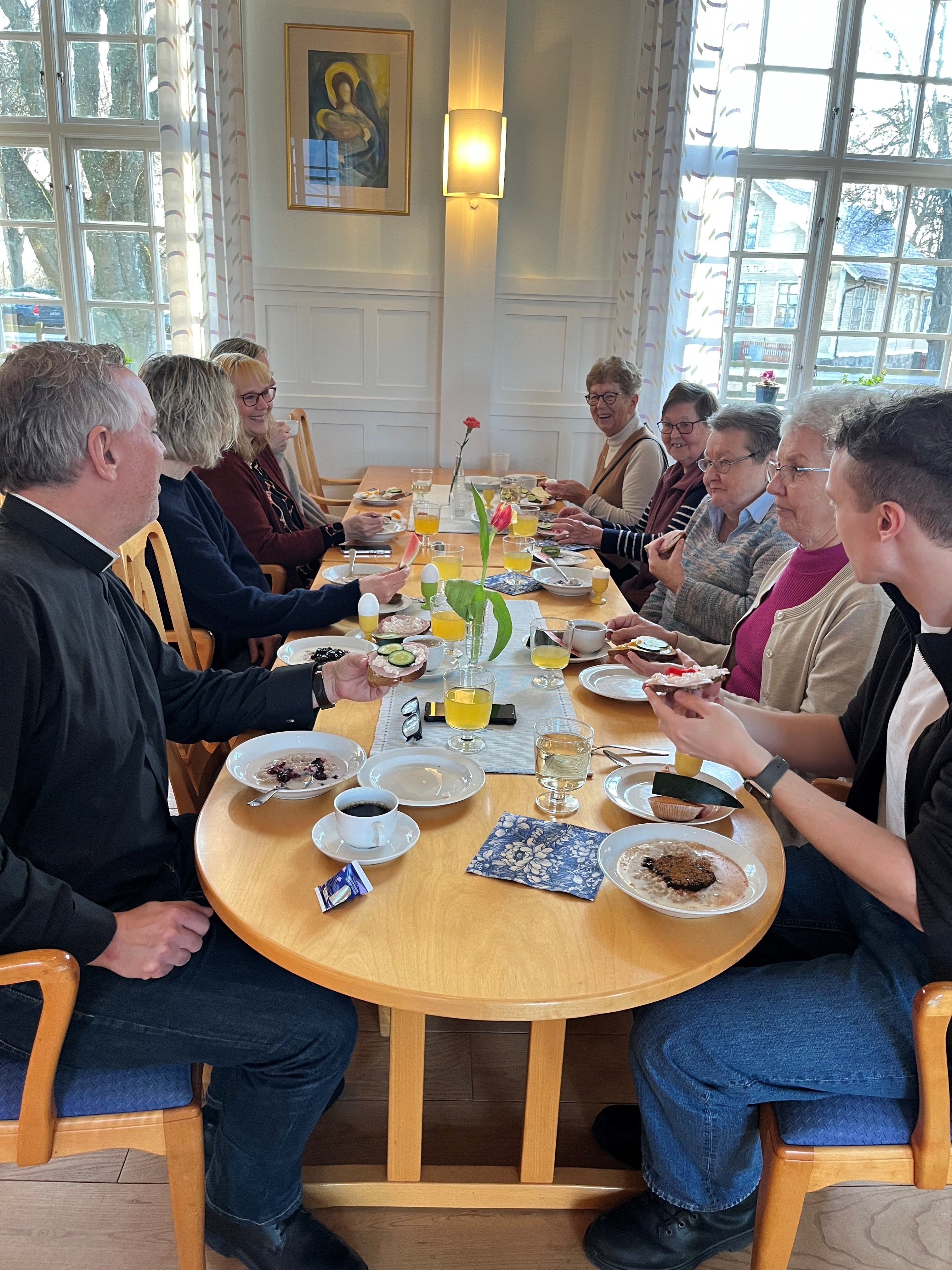 Enkel morgonmässa i församlingshemmet med kostnadsfri frukost efteråt.