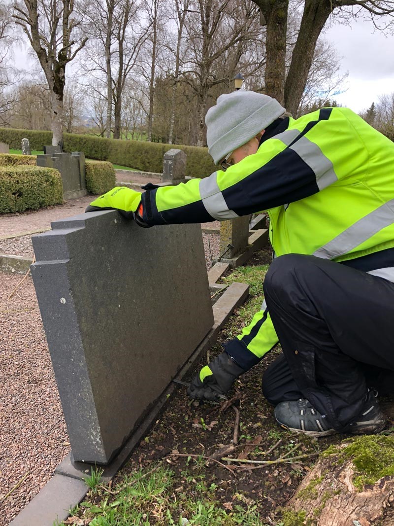 Om en gravsten utgör en risk informeras gravrättsinnehavaren via post om att gravstenen inte är godkänd samt att den behöver åtgärdas snarast. Vi sätter även en skylt på gravplatsen och säkrar tillfälligt upp den med stolpe och spännband om den utgör en akut fara.