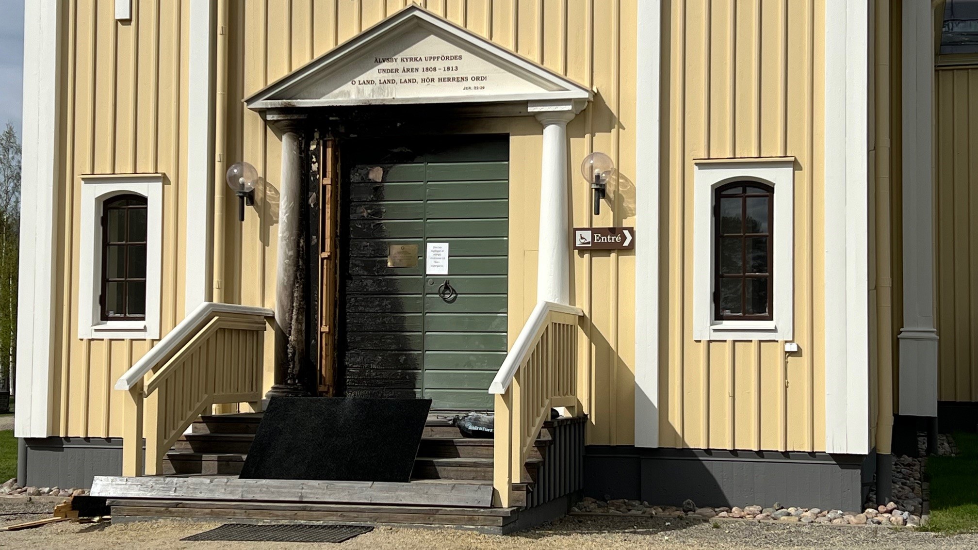 Natten till torsdag den 15 maj brann det vid Älvsby kyrka. En snabb insats från räddningstjänsten gjorde att skadorna kunde begränsas till huvudentrén.