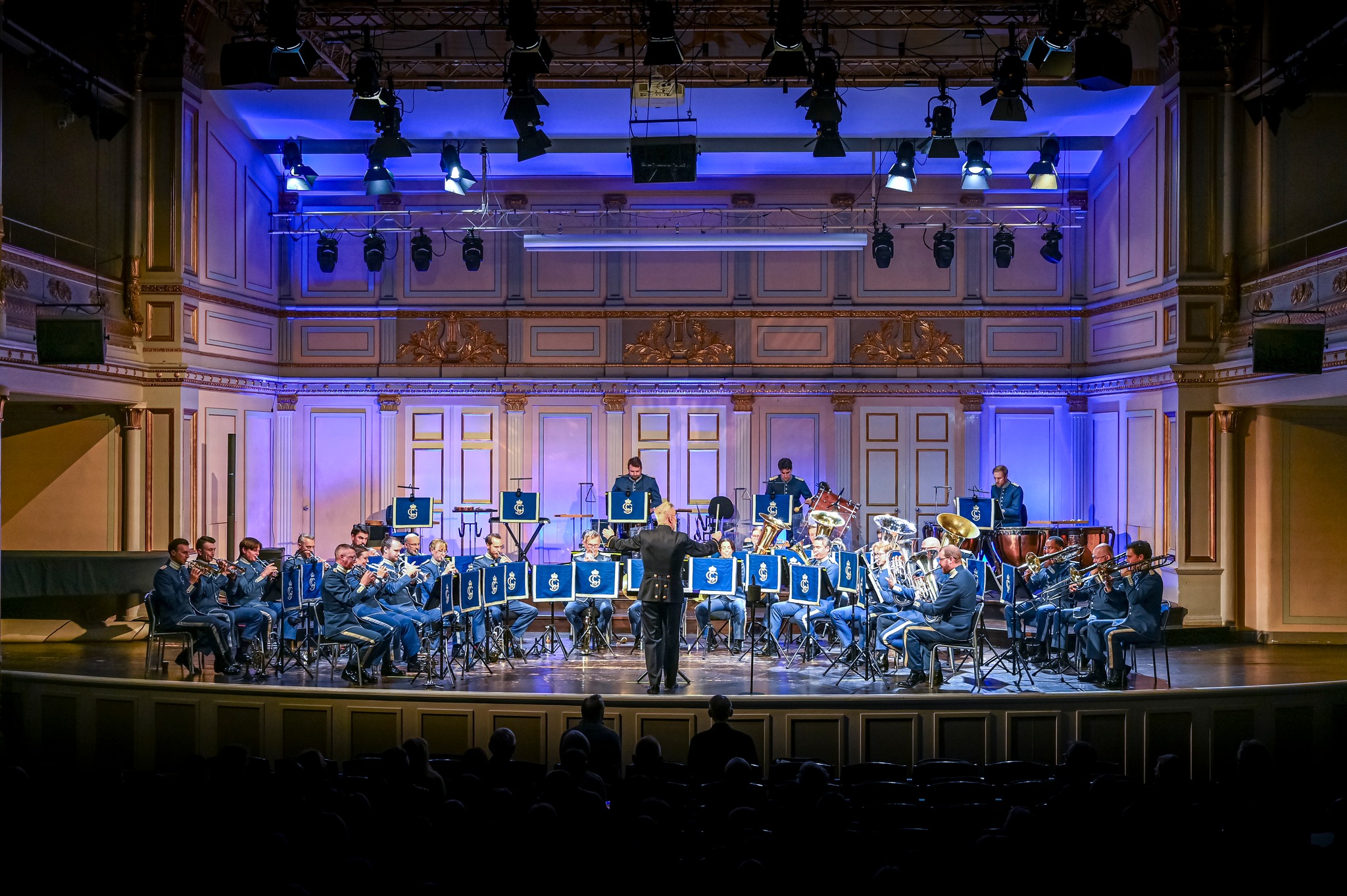 Musikerna i Livgardets dragonmusikkår bär den klassiska mellanblå dragonuniformen från 1895, även kallad Modell Äldre.