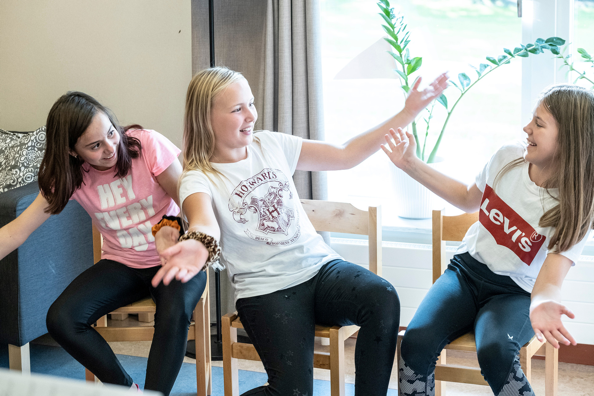 Vi fikar, leker, spelar spel, pysslar, lyssnar på musik, hänger och umgås.