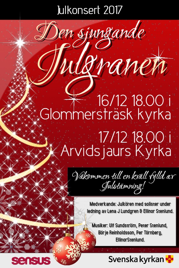 Årets julkonsert - Den sjungande julgranen - framförs av Julkören med solister under ledning av Lena Jakobsson Lundgren & Ellinor Stenlund lördag 16/12 klockan 18.00 i Glommersträsks kyrka och söndag 17/12 klockan 18.00 i Arvidsjaurs kyrka.