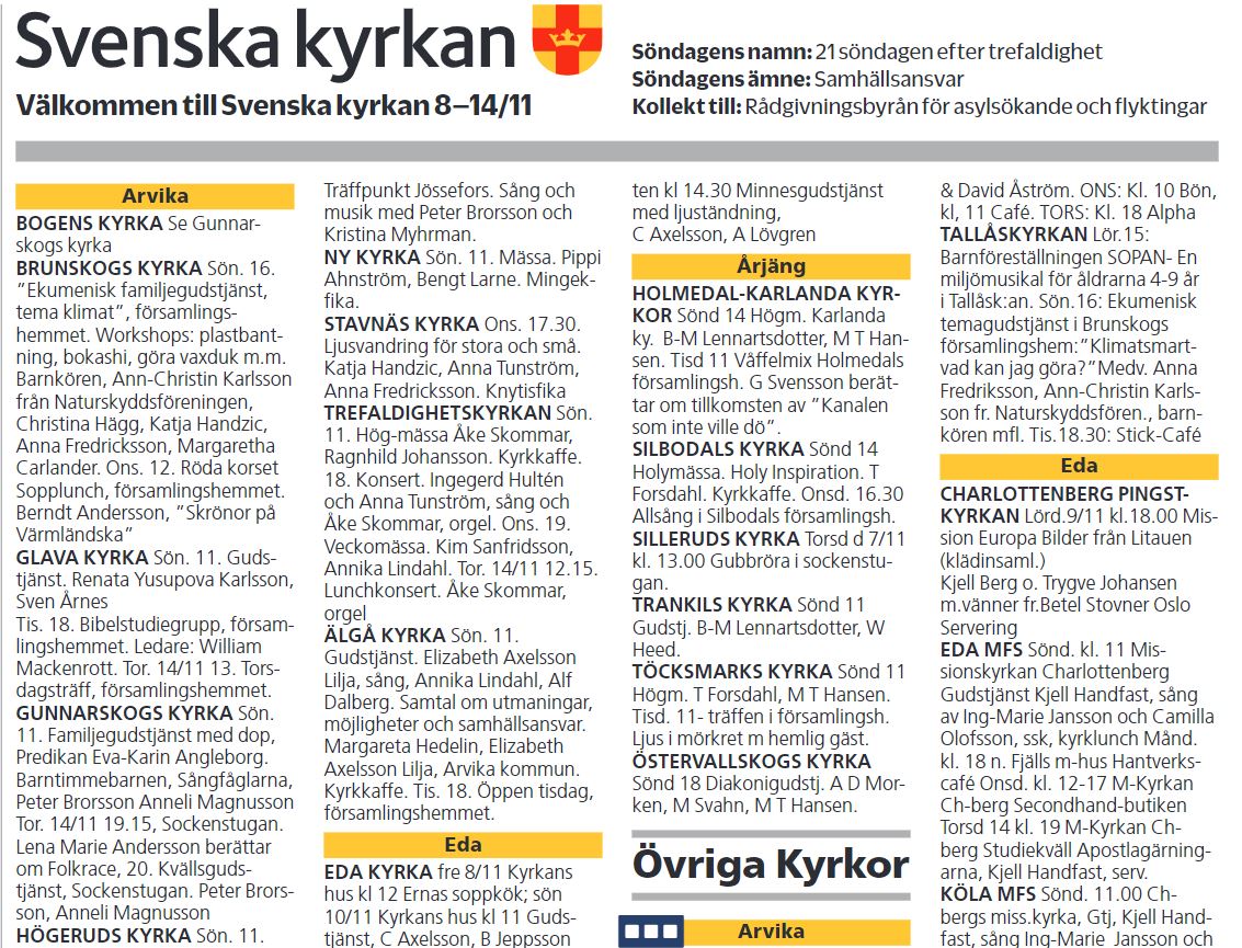 Från och med 1 oktober 2020 hittas predikoturerna inte i Arvika nyheter, NWT och VF längre, utan istället har du möjlighet att via webben, församlingens kalendarium, Saltaren eller hemskickat månadsblad se en uppdaterad och gemensam kalender för Svenska kyrkans församlingar inom Arvika kommun.