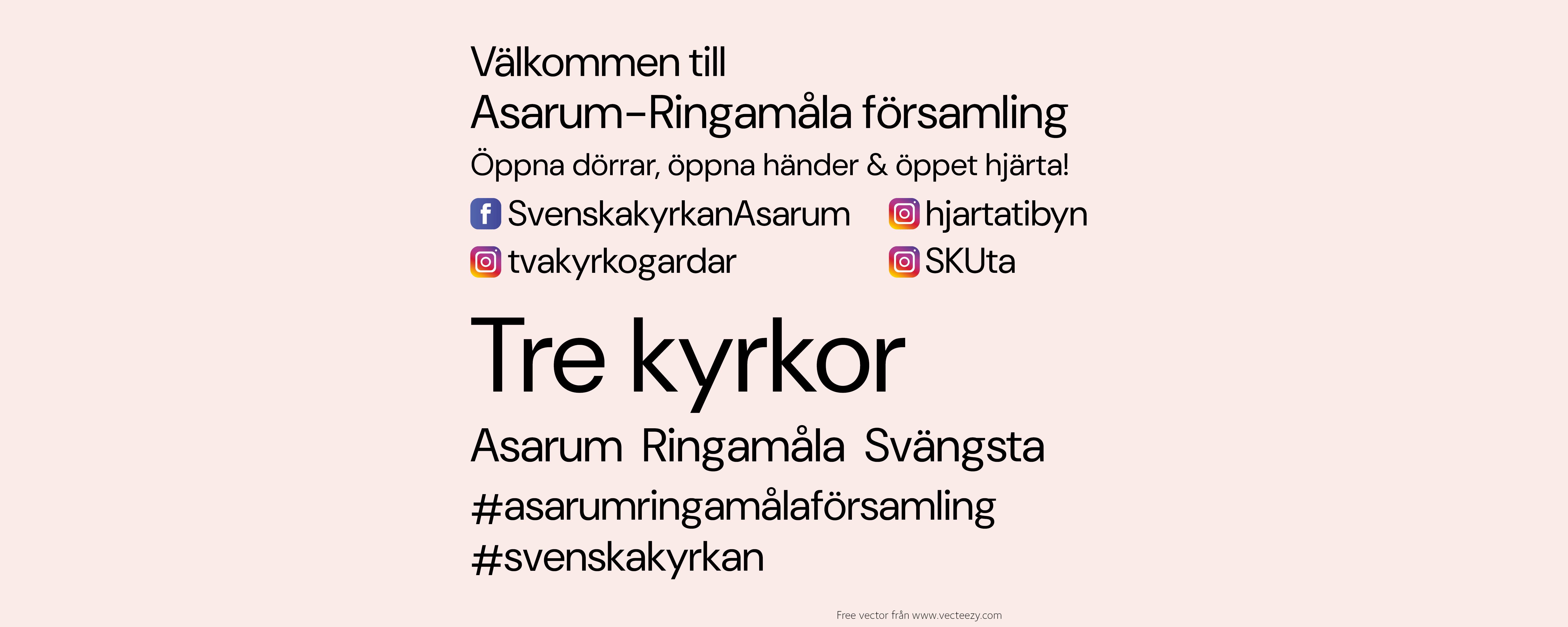 Välkommen till Asarum-Ringamåla församling tre kyrkor! Här har människor i generationer mött Gud genom gudstjänster, kyrkliga handlingar, konserter, etc. Här kan du stanna till i tystnad och stillhet och tända ett ljus.