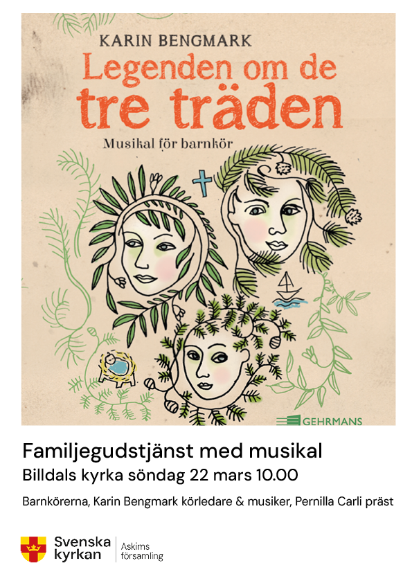 Billdals kyrka söndag 22 mars 10.00. Barnkörerna framför Legenden om de tre träden, en musikal för barnkör av Karin Bengmark, i familjegudstjänsten. Karin Bengmark körledare & musiker, Pernilla Carli präst.