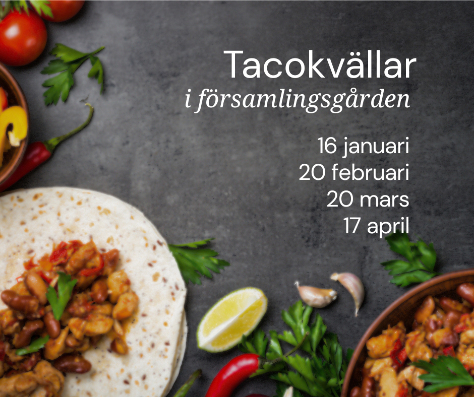 Bjud gärna med dig vänner, mor- och farföräldrar eller grannar. Tänk att slippa laga mat på fredag kväll! Vi äter tacos tillsammans under en mysig gemenskap på församlingsgården.