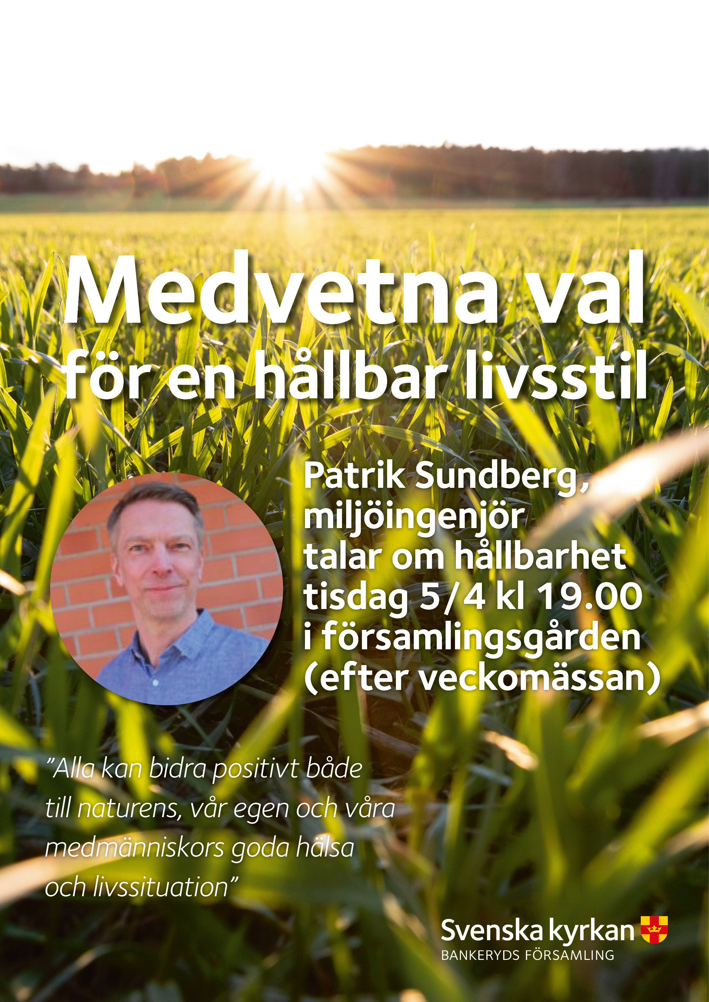 Patrik Sundberg, miljöingenjör talar om Medvetna val för en hållbar livsstil tisdagen 5/4 kl 19.00 i församlingsgården (efter veckomässan). Varmt välkommen till en inspirerande kväll!