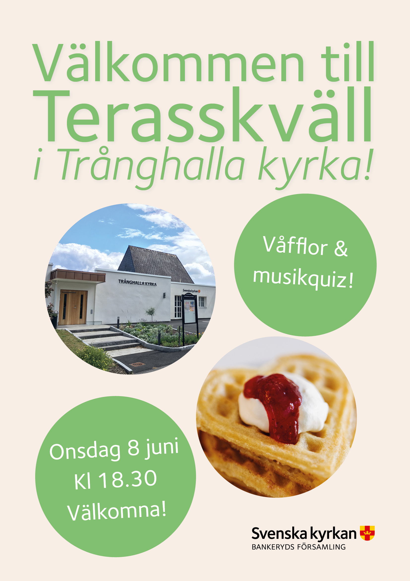 Välkommen till Terasskväll i Trånghalla kyrka! Servering av våfflor och musikquiz. Onsdag 8 juni kl 18.30