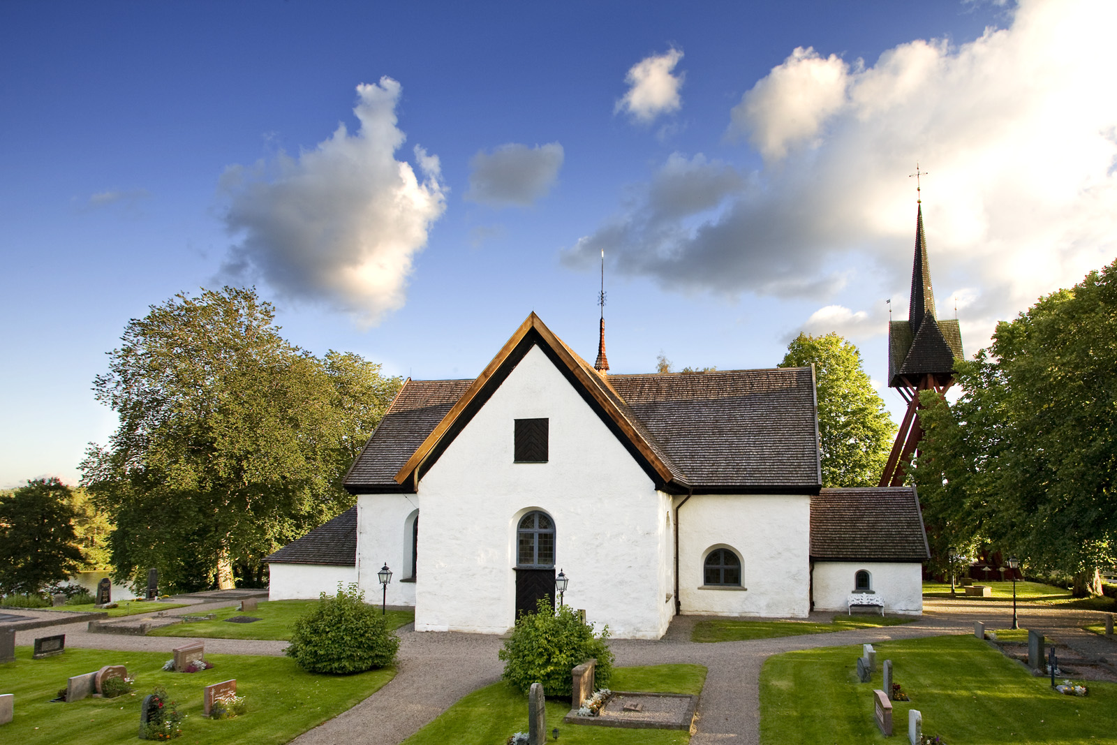 Barnarps kyrka, prästgård och församlingsgård ligger vackert längs Barnarpssjön.