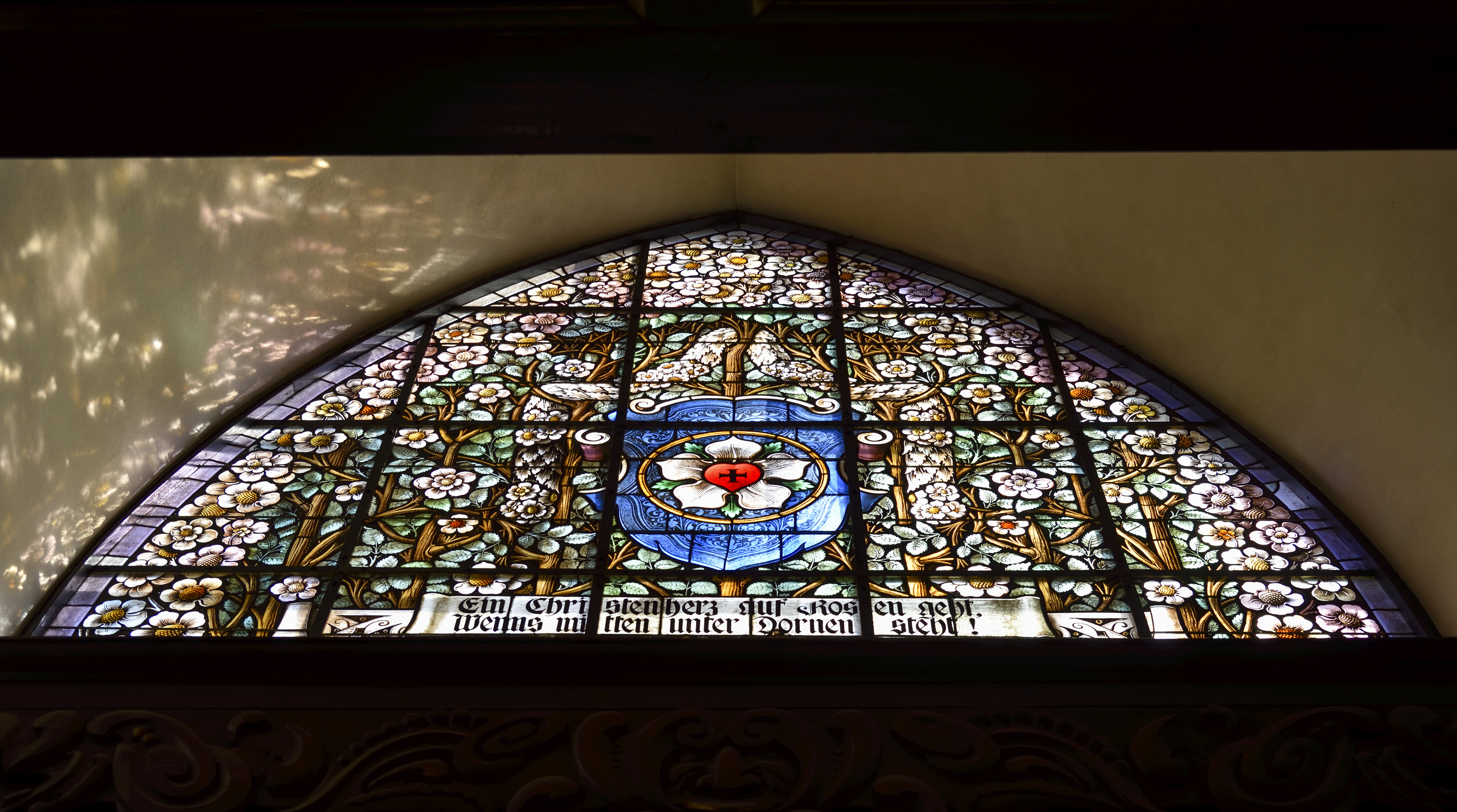 De sevärda glasmålningarna som bland annat föreställer Jesu uppståndelse är utförda av N. P. Ringström.