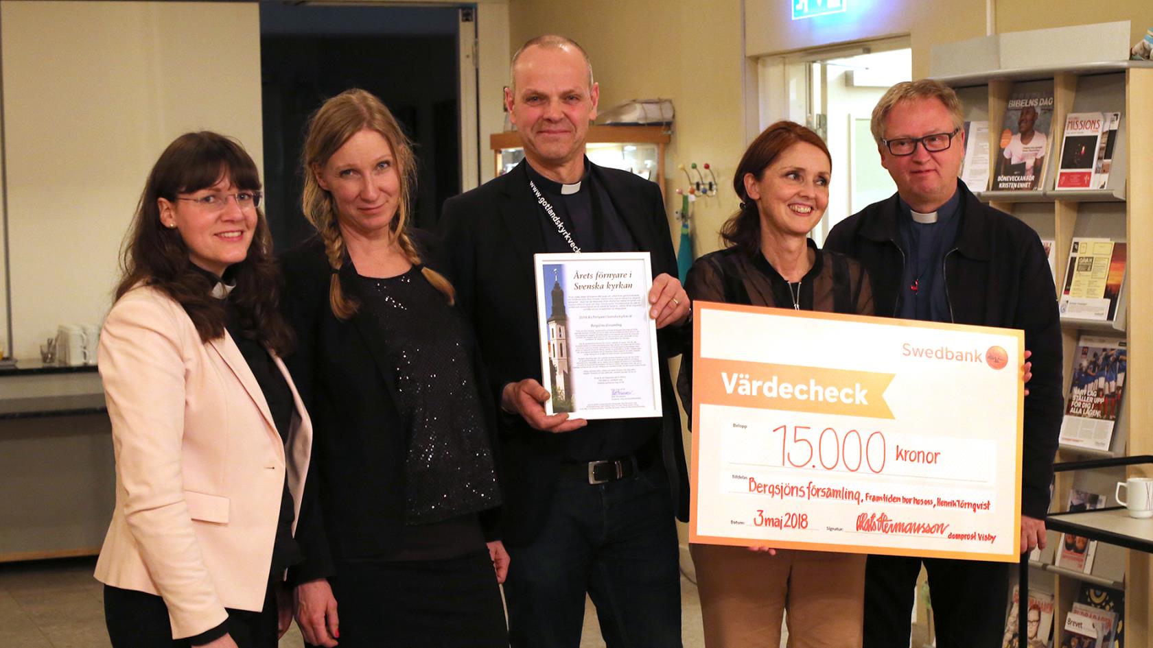 Johanna Linder, kommunikatör i Vantörs församling och samordnare för nätverket samt representant för Stockholm, tar emot priset tillsammans med Christina Byström, (representant för Göteborg), Ewa-Sofia Gudmundsson (representant för Malmö) och Henrik Törnqvist, församlingsherde i Bergsjöns församling och ordförande i nätverket FBHO. Dessutom finns hela Bergsjöns församling med vid prisutdelningen.