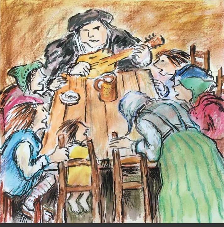 Med hjälp av sånger som Åsknatten, Nunnan i tunnan, Soli Deo Gloria, gyckelspel om avlatsbrev och utbildning, barnens påhittade lek ”Bannbulla” och samtal kring bordet, berättas händelser ur Luthers liv och reformationshistorien.
