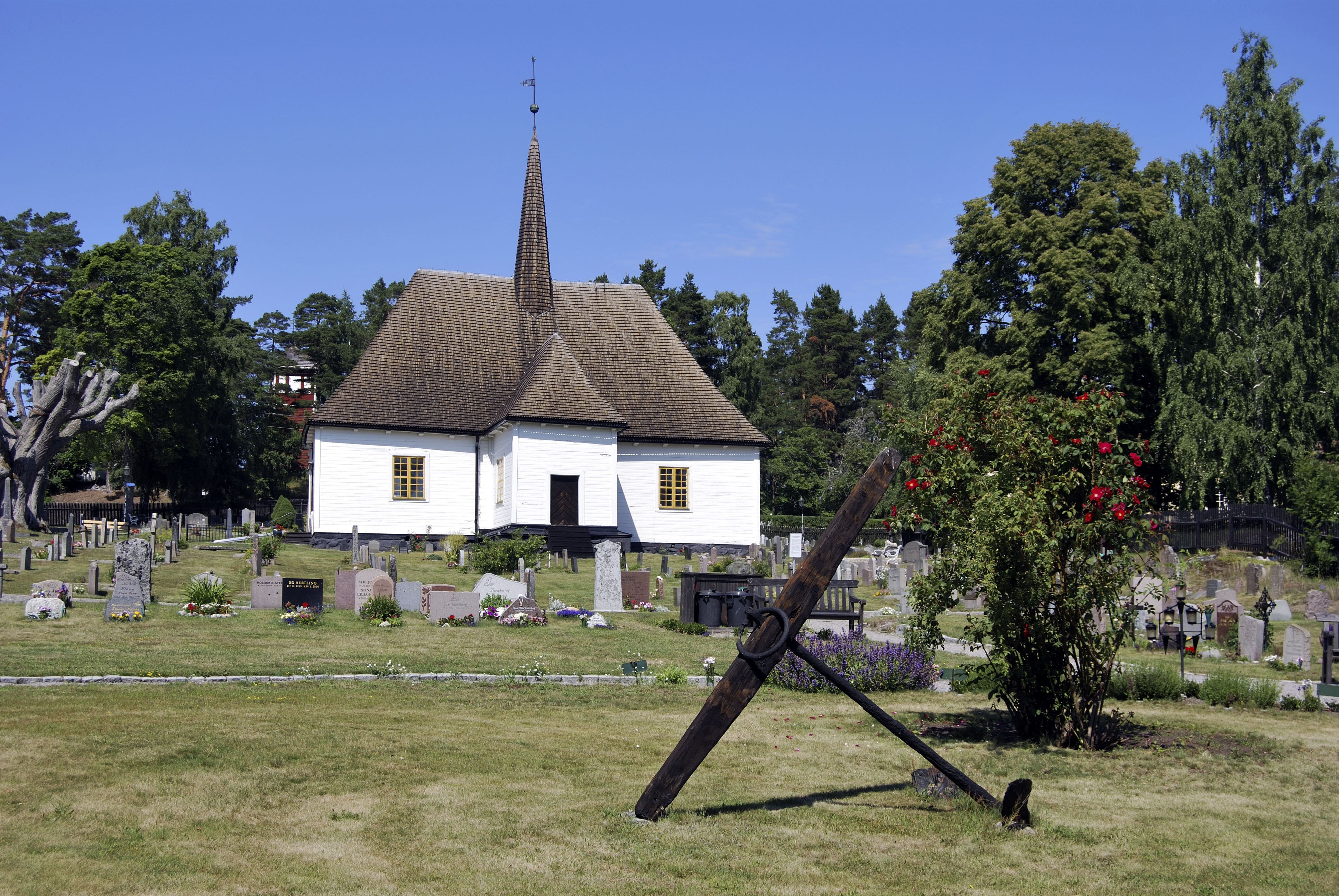 Under 1600-talets första hälft fanns två kyrkogårdar, den ena på nuvarande plats och den andra längre in vid Djurhamn. Den nuvarande kyrkogården, som omges av trästaket, är flera gånger utvidgad. En cirkelformad minneslund ligger i den del av kyrkogården som tillkom 1986.