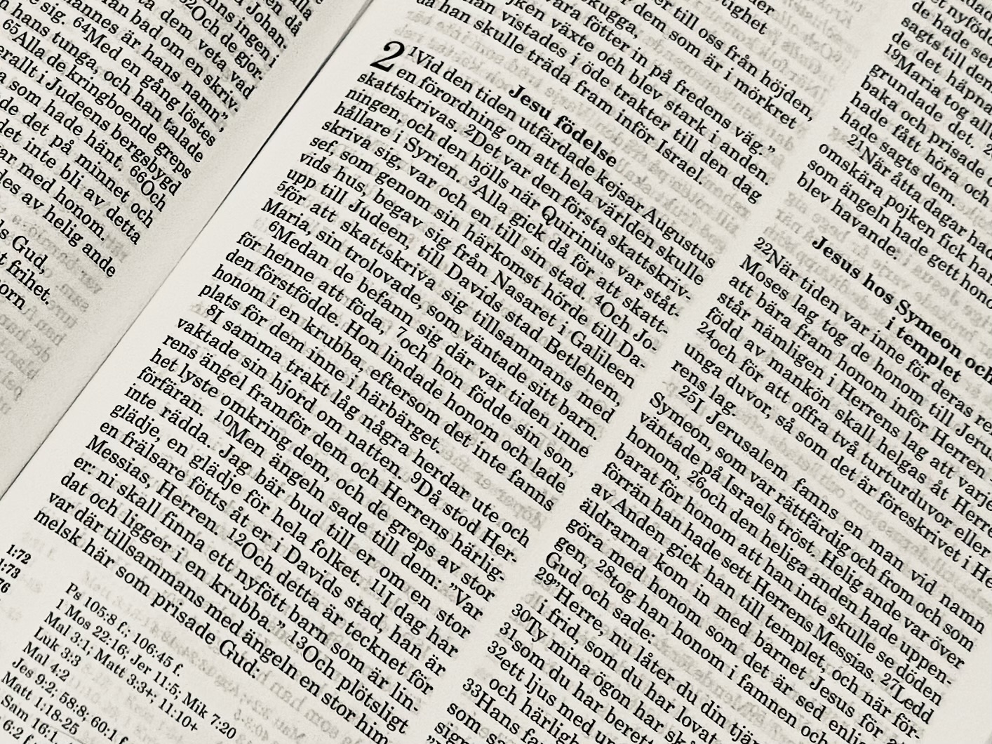 I samma trakt låg några herdar ute och vaktade sin hjord om natten. Då stod Herrens ängel framför dem och Herrens härlighet lyste omkring dem, och de greps av stor förfäran. Men ängeln sade till dem: "Var inte rädda. Jag bär bud till er om en stor glädje, en glädje för hela folket. I dag har en frälsare fötts åt er i Davids stad, han är Messias, Herren. Och detta är tecknet för er: ni skall finna ett nyfött barn som är lindat och ligger i en krubba." Och plötsligt var där tillsammans med ängeln en stor himmelsk här som prisade Gud: "Ära i höjden åt Gud och på jorden fred åt dem han har utvalt."