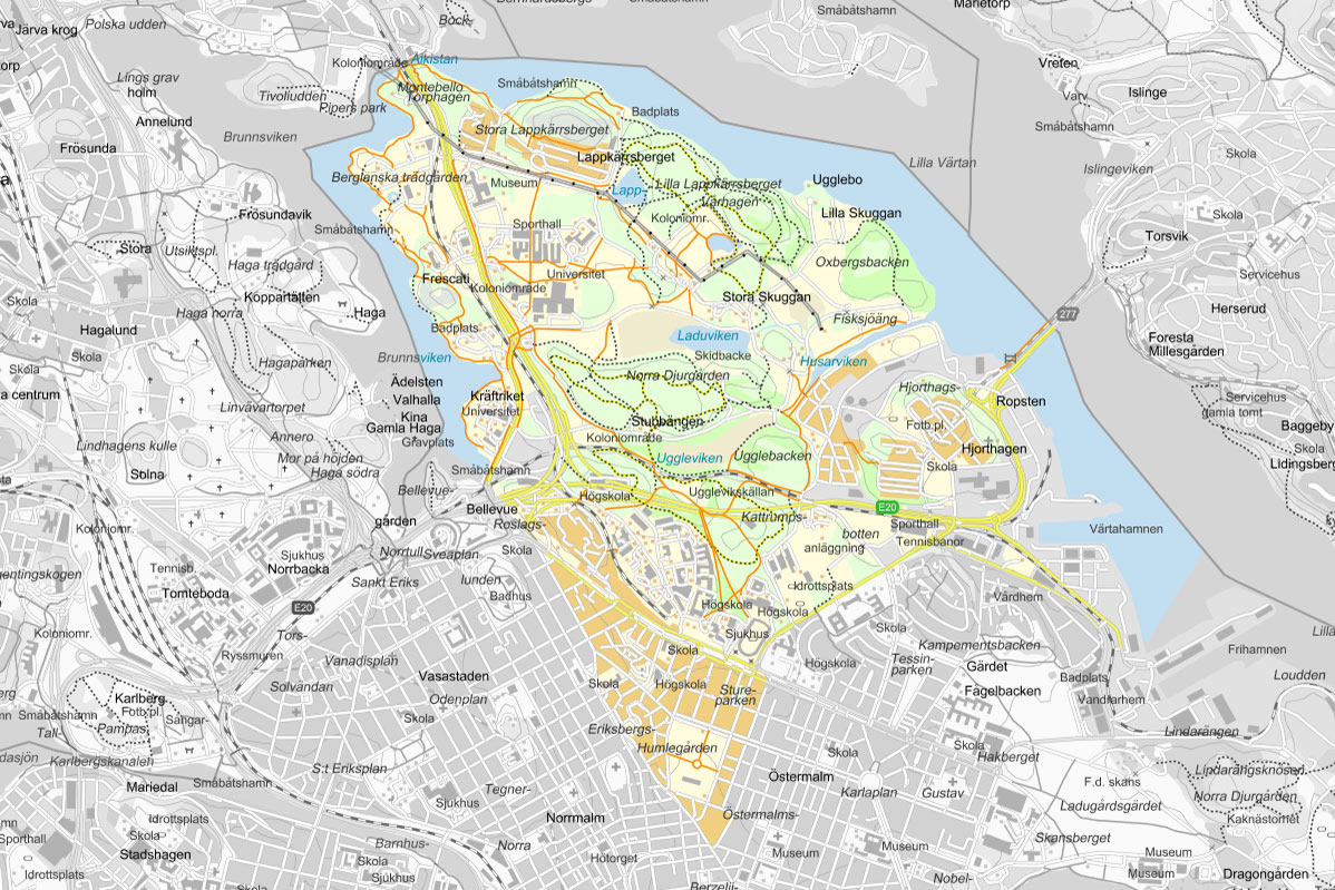 Engelbrekts församling bildar på kartan en triangel med norra spetsen vid Ålkistan, östra spetsen vid Värtahamnen och södra spetsen vid Stureplan. Gränsen mot innerstaden följer Tegeluddsvägen, Lidingövägen, Brahegatan och Birger Jarlsgatan.
