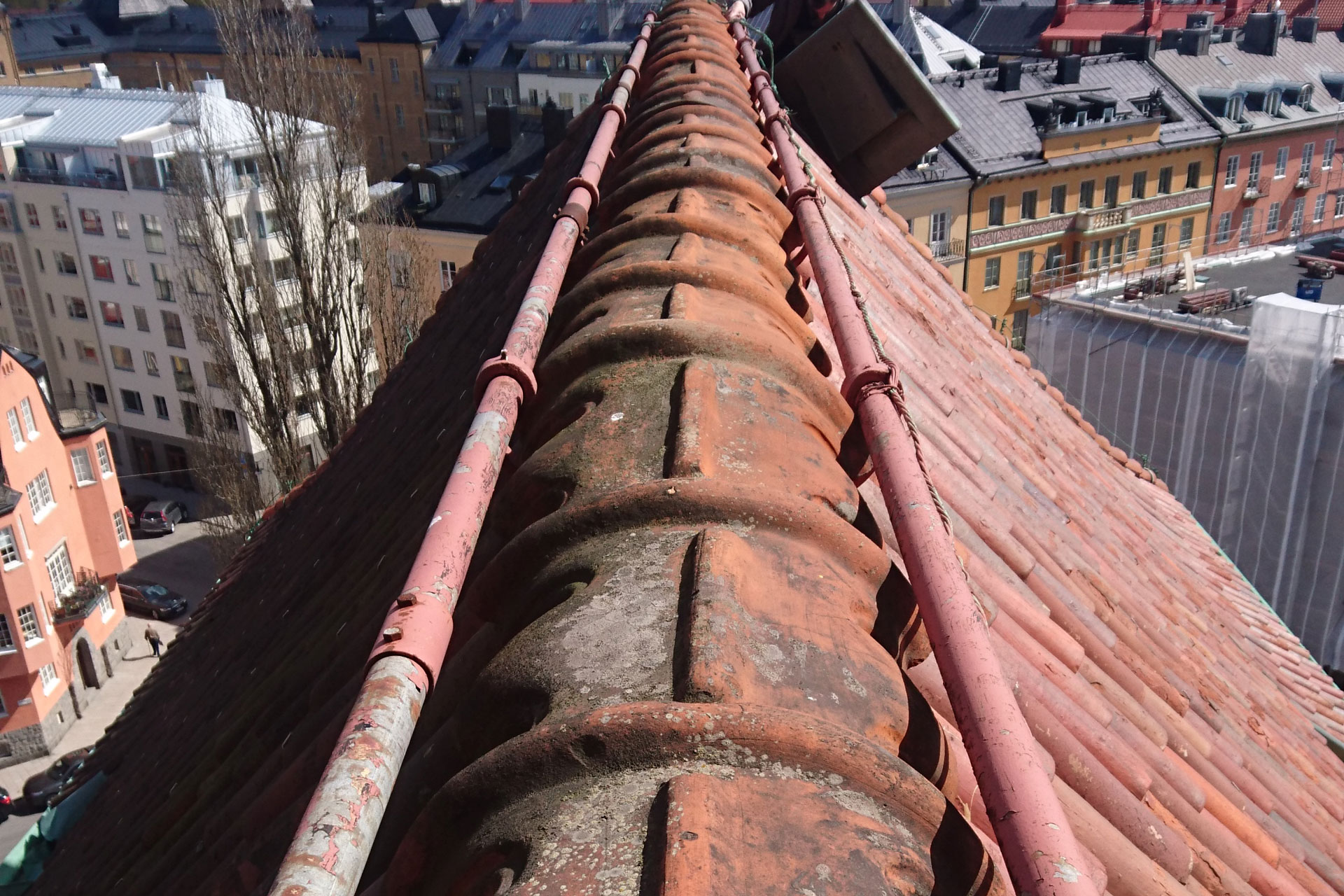 Engelbrektskyrkans tak läggs om. Varje enskild takpanna tas varsamt ner och rengörs. De allra flesta kommer att läggas upp på taket igen. Flera takpannor är i så dåligt skick att de måste bytas ut. Nya tegelpannor håller på att tillverkas vid ett tegelbruk där de enorma pannorna formas för hand och att bränns i ugnar som har varit igång i mer än hundra år. Detta gör vi för att de nya pannorna ska bli så lika de gamla som möjligt.