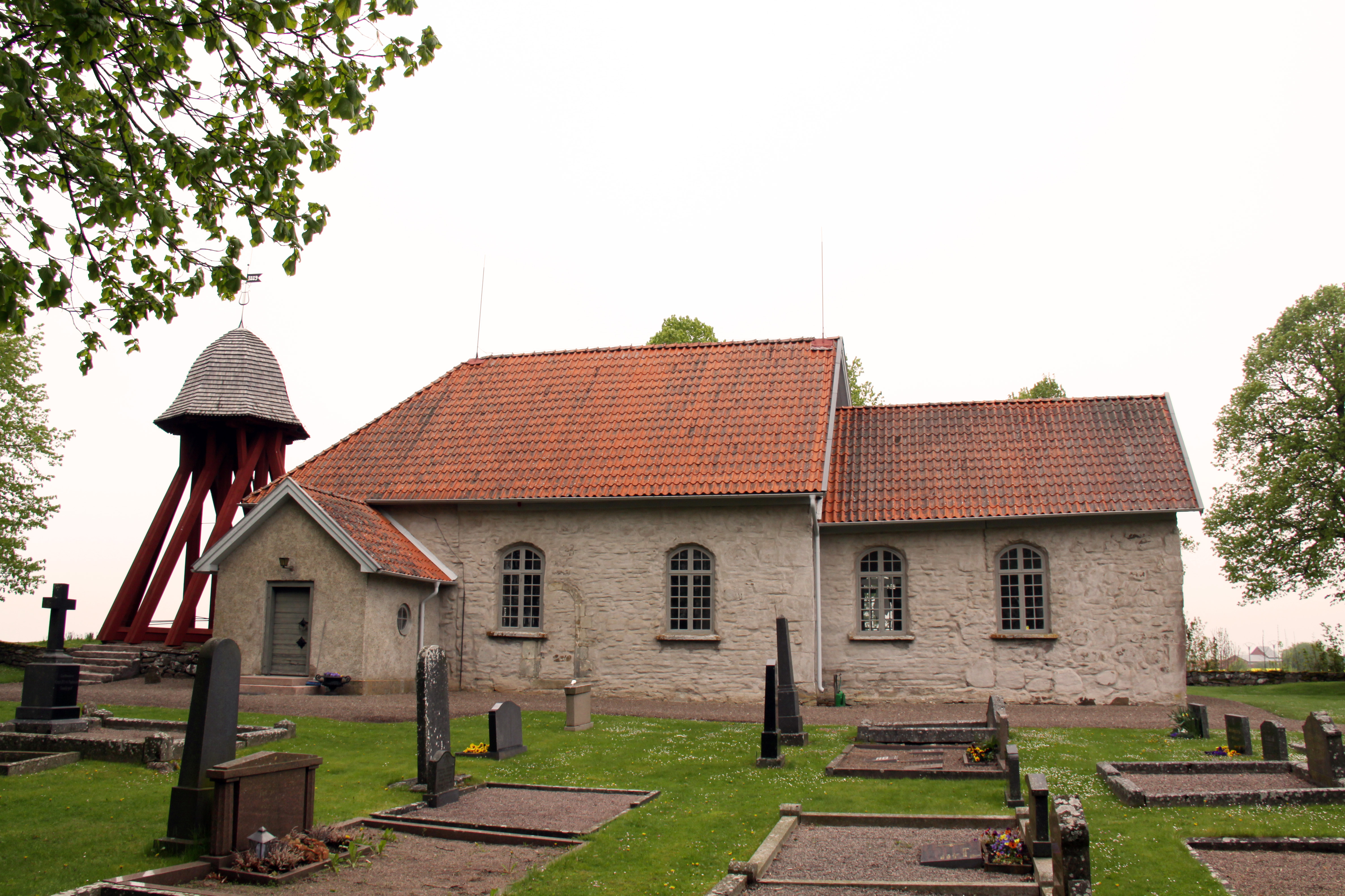I väster, där det höga, spetsiga röstet är kraftigt sneddat och där kyrkan nu har en gavel utan dörr men med ett fönster i mitten, har förr funnits ett torn som förmodligen raserades i början av 1700-talet. Senare, på 1780-talet, bygges istället den nuvarande klockstapeln på ett underlag av stenar som tydligen tillhört det nedrasade tornet.