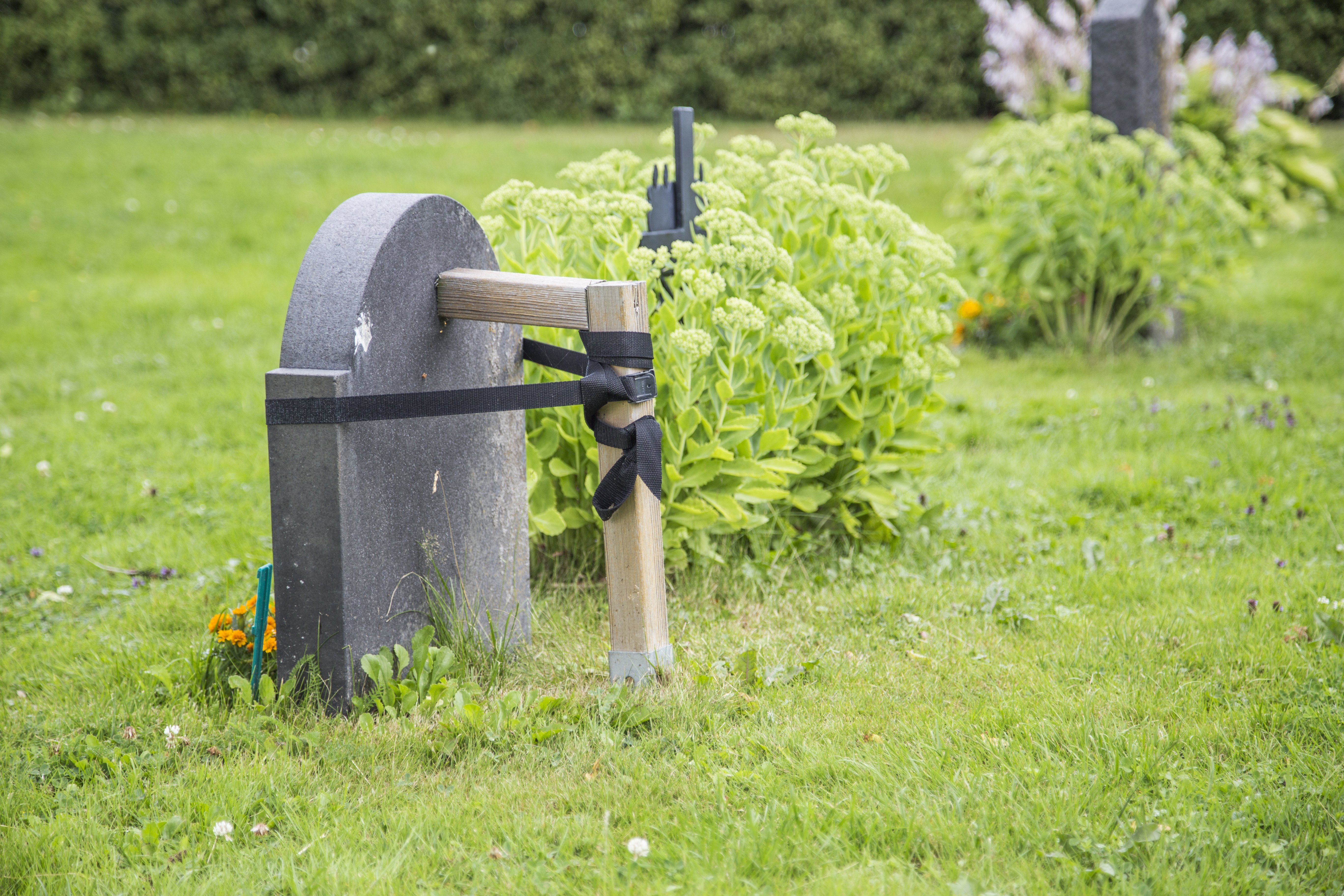 "Gravstenen ej förankrad. Vänligen kontakta vaktmästaren."