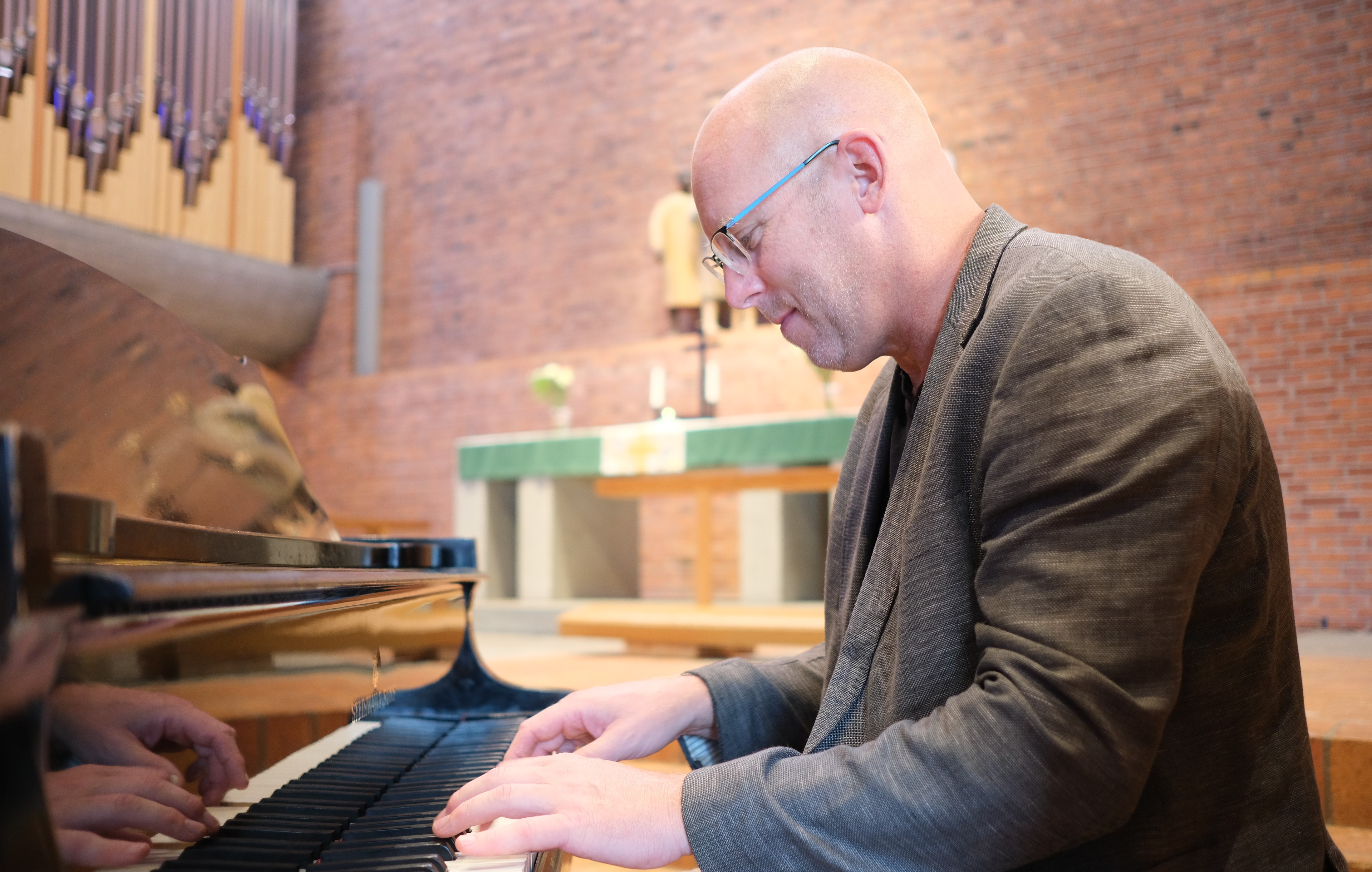 Tjänsten jag har nu i Söderled kan beskrivas som en normal kyrkomusikertjänst med ganska brett innehåll (vilket även tjänsten i Sköndal var). Jag spelar vid olika typer av gudstjänster, vid dop, bröllop och begravningar, jag leder två vuxenkörer och hjälper min kollega med barnkörerna. Bland annat! Min musikaliska bakgrund har ju gjort att jag rört mig i många olika genrer. Det har jag försökt ta till vara i arbetet som kyrkomusiker. Jag älskar den klassiska kyrkomusiken men har även försökt att göra annan typ av musik vid både gudstjänster och konserter. Att jag trivs så bra som kyrkomusiker beror till stor del på den bredd och variation som jobbet innebär.