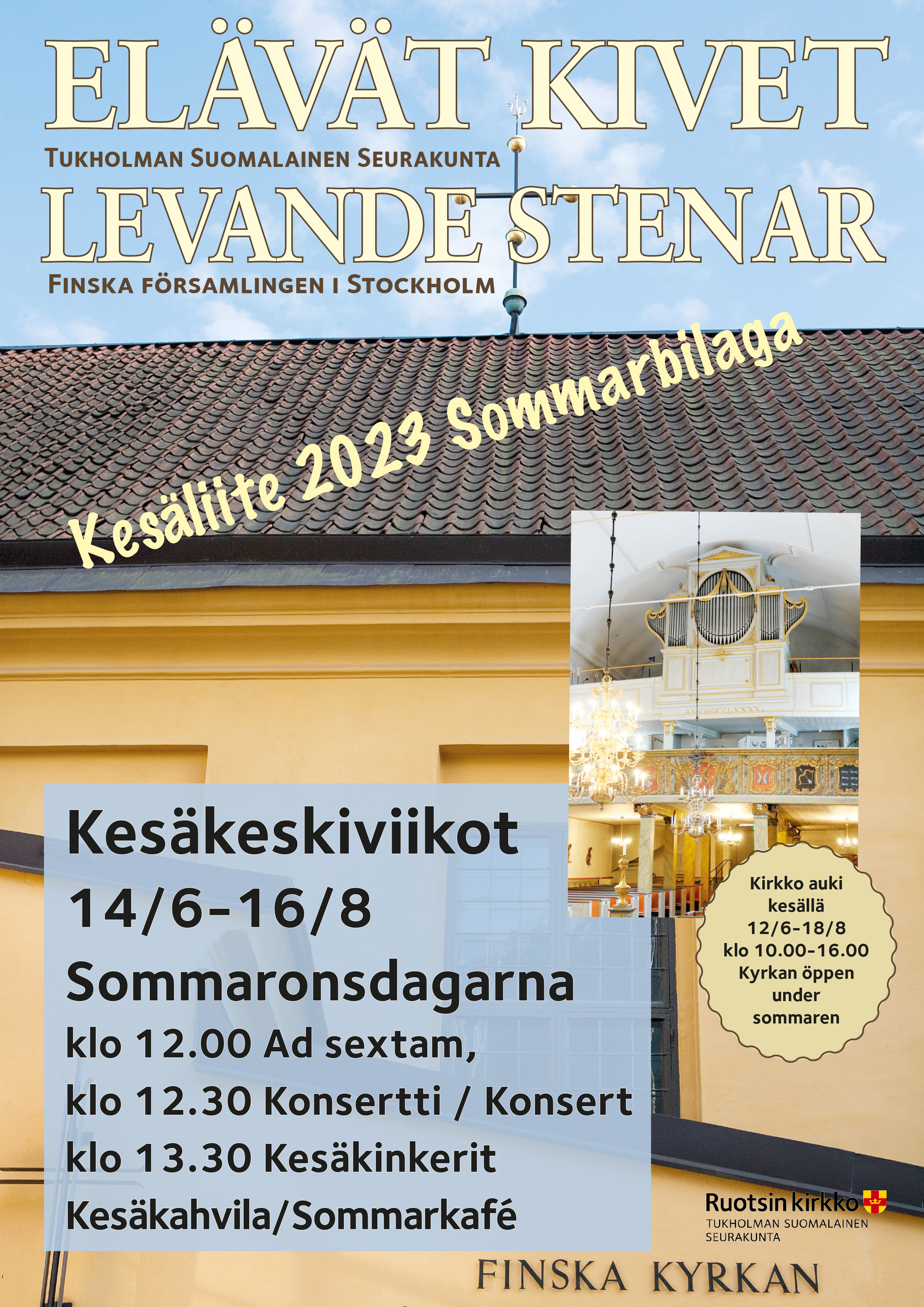 Seurakunnan kesäliite sisältää kesän tapahtumat. Liite löytyy PDF muodossa tästä tai sitten voit hakea sen kirkolta. Församlingen ger ut en sommarbilaga med information om vad som händer i kyrkan under sommaren. Bilagan finns här i PDF format eller så kan du hämta den från kyrkan.