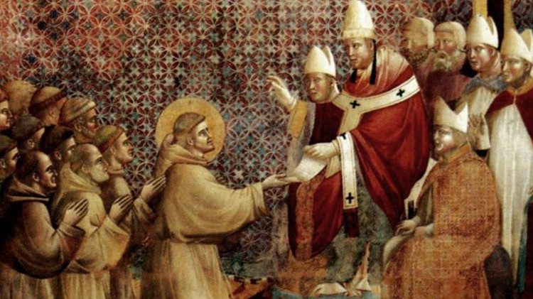 År 1209, när Franciskus lilla följe hade växt till 12 medlemmar, begav han sig till påven för att få sitt brödraskap officiellt erkänt. Med sig hade han en författning som han skrivit och som lade tonvikten vid ett enkelt liv i enlighet med evangeliets ord.