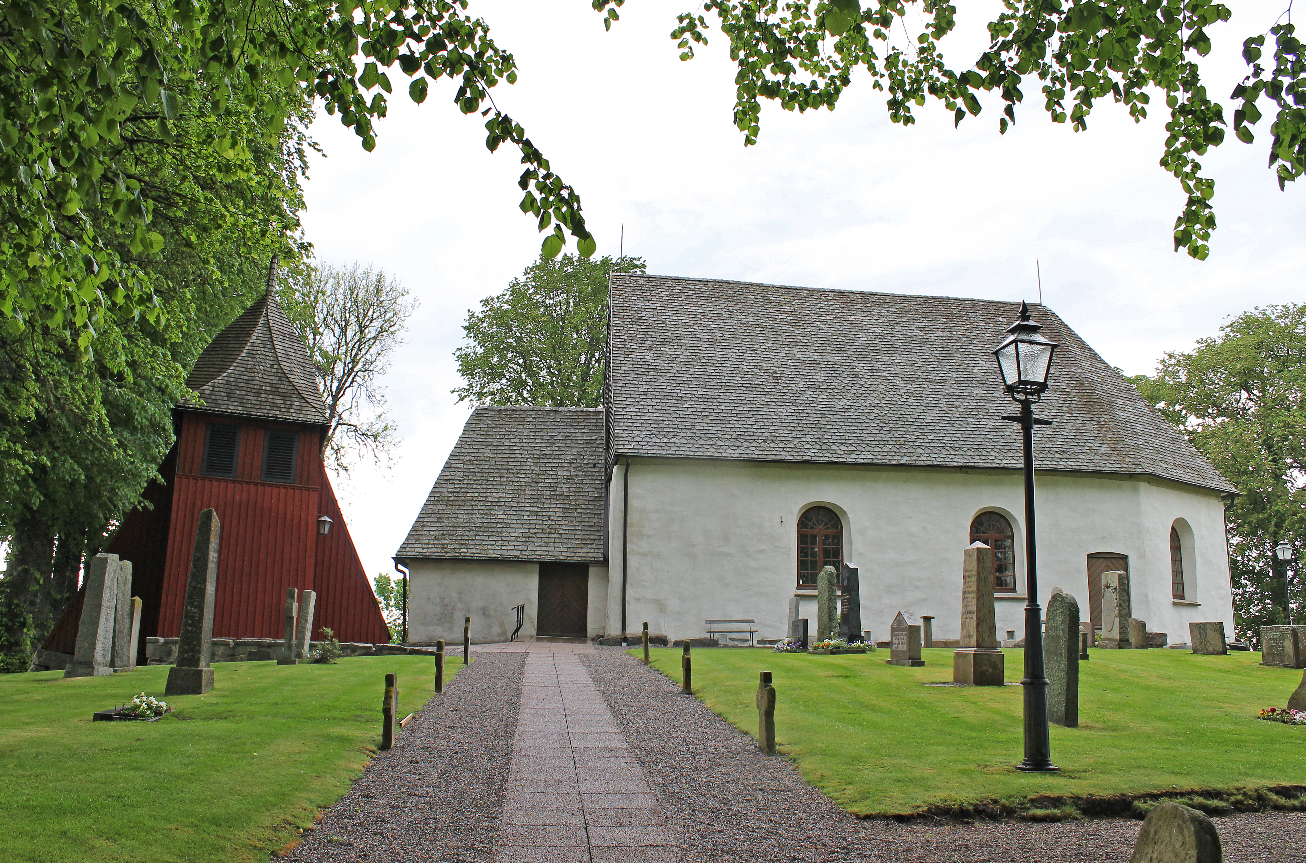 Klockstapeln som byggdes 1818 i stället för en äldre har två klockor. Storklockan är 125 cm diameter är den enda som används. Dock saknar den inskrift. Den lilla klockan är daterad till 1400-talet. Vid kyrkans omyggnad på 1740-talet inmurades i nordöstra korväggen en runsten med textsidan utåt. Ristning är från senare hälften av 1000-talet. Texten lyder "Tore reste denna sten efter Karl, sin bolagsman, en mycket duktig ung man." En rusten med samma text finns i Hobro på Jylland och åsyftar troligen samma män.