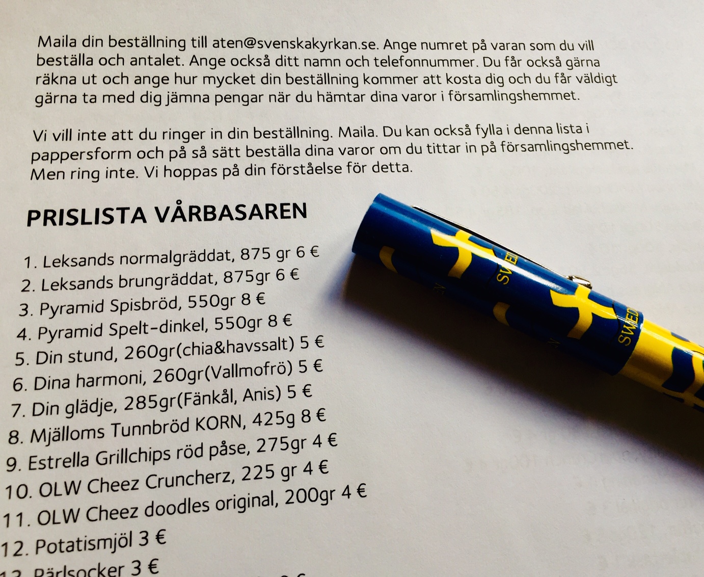 Vi vill inte att du ringer in din beställning. Maila. Du kan också fylla i denna lista i pappersform och på så sätt beställa dina varor om du tittar in på församlingshemmet. Men ring inte. Vi hoppas på din förståelse för detta.
