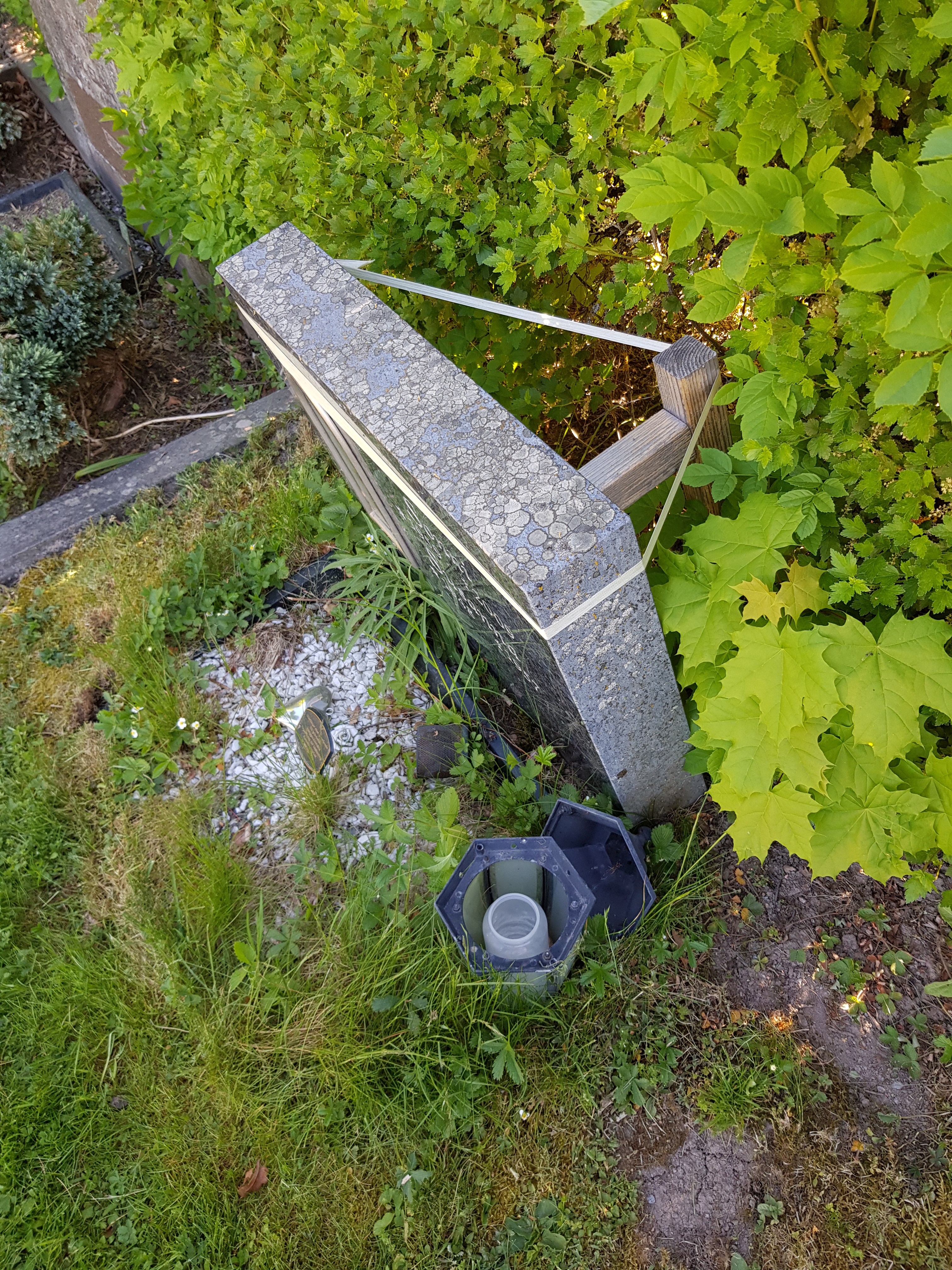 De gravstenar som inte klarar säkerhetskontrollen säkras tillfälligt med trästolpe och band.