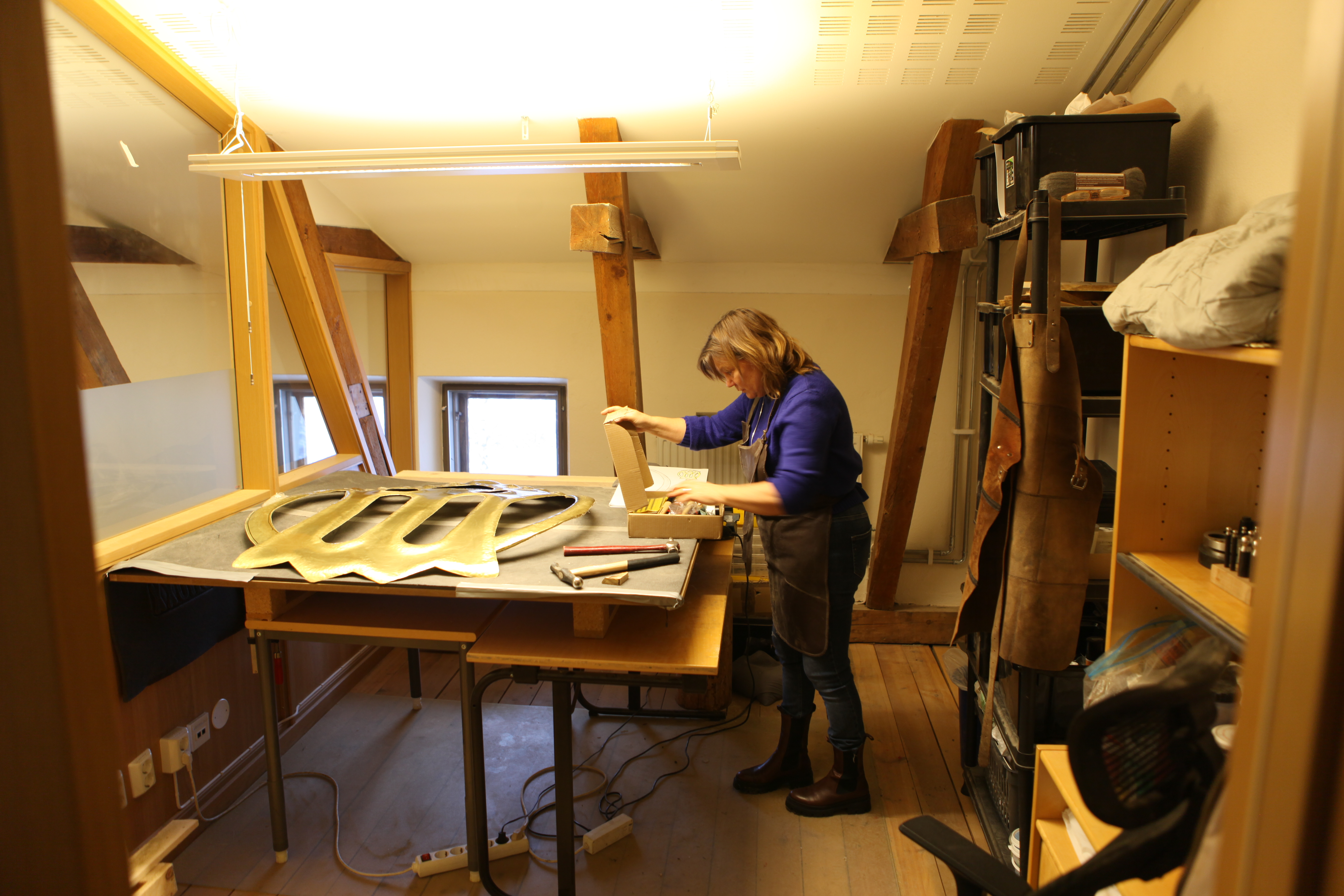 – Jag är en sån som tycker om att hitta innovativa vägar och klura på lösningar under tiden jag jobbar. Konstverket bestämmer vilken teknik och vilka verktyg jag ska använda. I det här fallet kunde jag inte elda hej vilt eller skaffa smedja. En-millimeters plåt kan jag kalldriva och mässing är ett vackert material som står för beskydd. När det var klart och bestämt var det bara att sätta igång och lösa uppgiften.