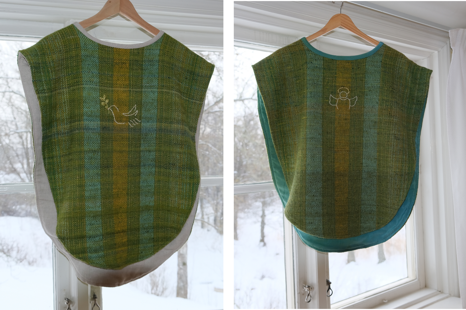 Vävgruppen har under ett par år jobbat med att ta fram en ny grön mässhake till församlingen. Garn har kardats, spunnits och färgats. Det har provvävts och två små barnmässhakar har tagits fram för att prova olika färger och vävtekniker.