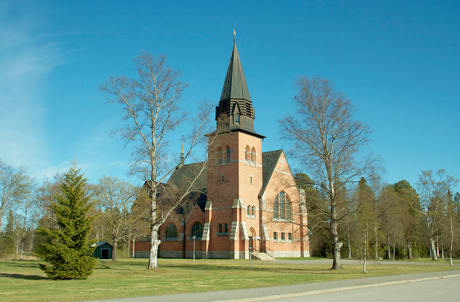 Kyrkan är byggd i tegel med inslag av granit och ritades av arkitekt Bror Almqvist. Arkitekturen är en blandning av jugend, nygotisk och nationalromantisk byggnadsstil. Koret och sidoskeppet är försedda med stjärnvalv och Almqvist designade även läktare, altartavla, predikstol, bänkar och dopfunt.