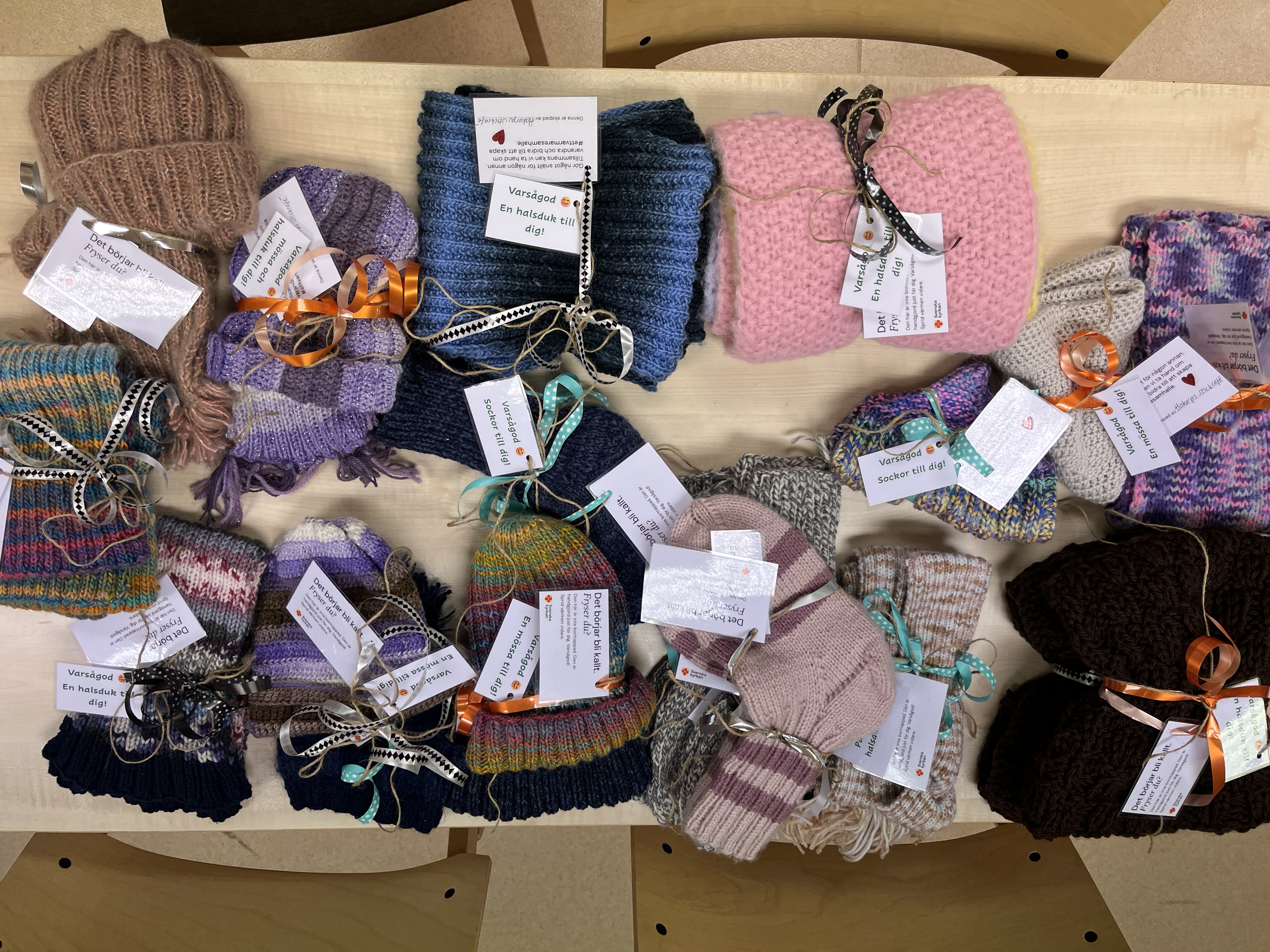 Hos oss i Huskvarna pastorat har Hakarps stickkafé bidragit med många stickade alster. I Huskvarna, Öxnehaga och Hakarp placerades i arla morgonstund ut mössor, vantar, halsdukar och sockor på bänkar, busshållplatser, tågstationer, utanför Huskvarna vårdcentrum och affärer.