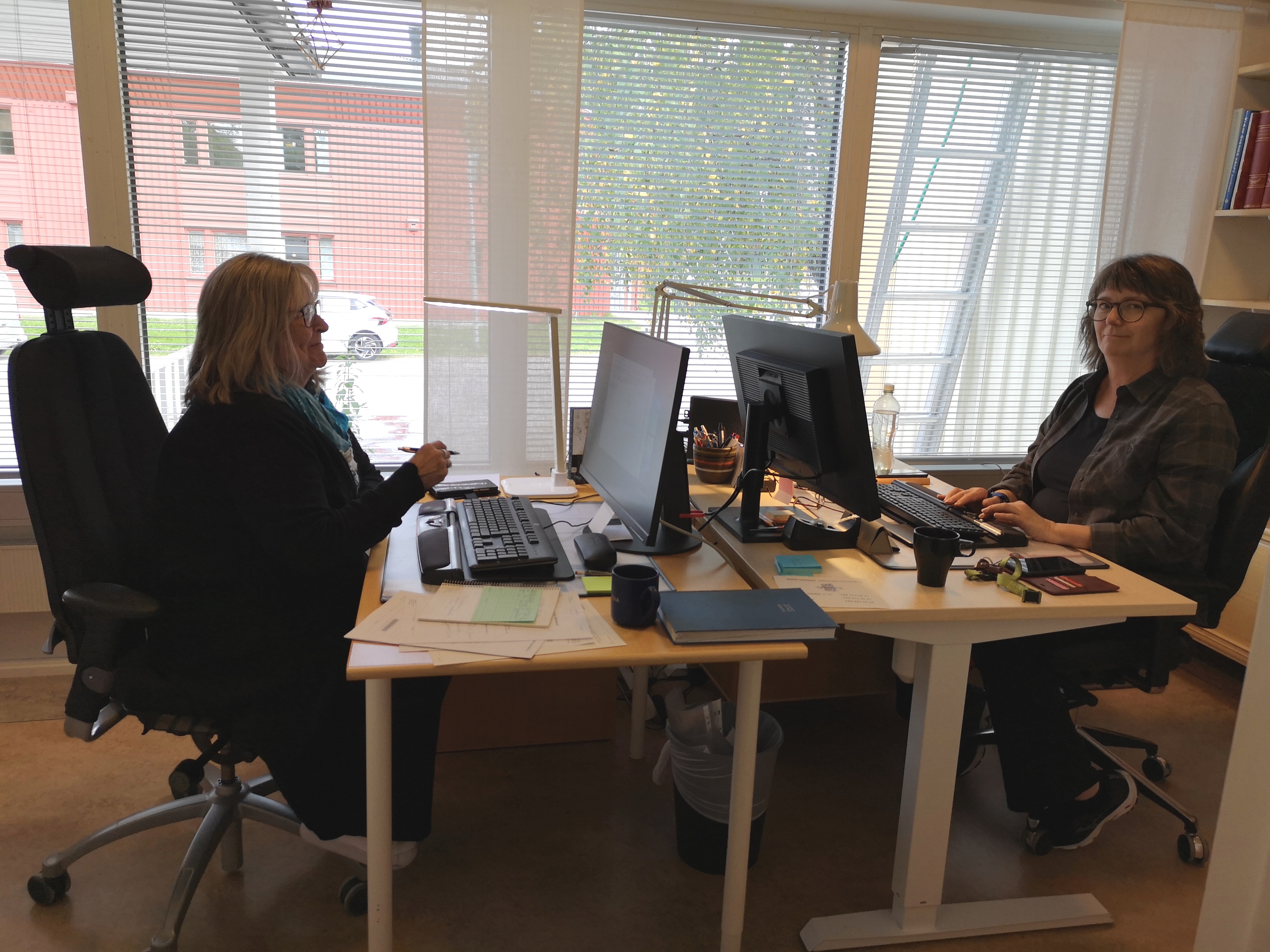 Lena och Anitha hälsar välkommen i nytt kontor.