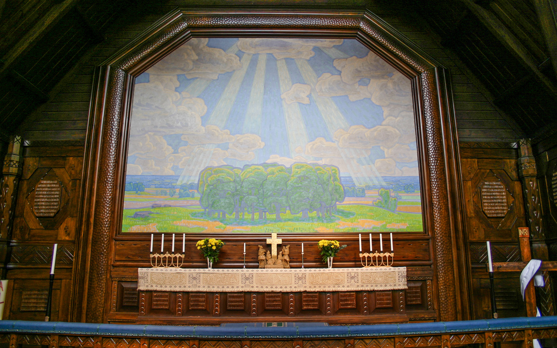 Prins Eugen har målat altartavlan, som föreställer ett stiliserat, solbelyst landskap.