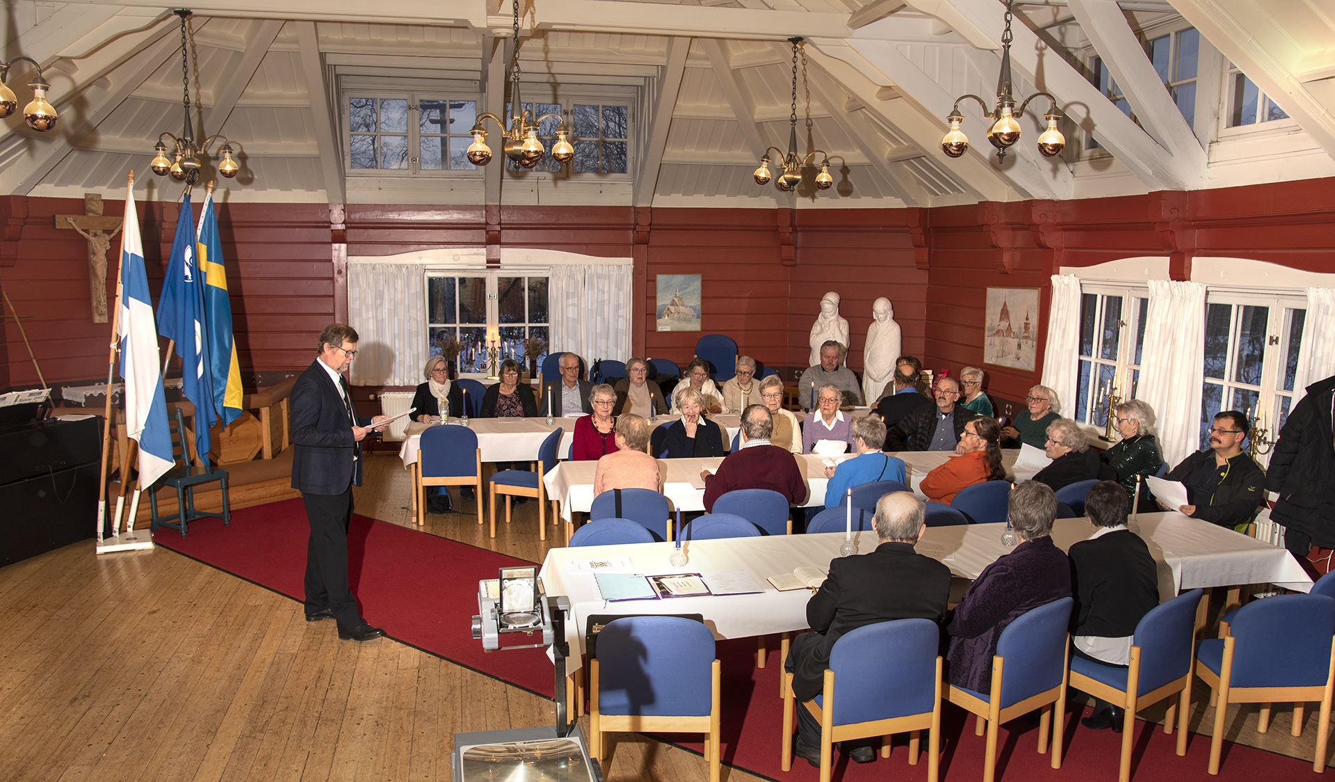 På tisdagen 6 december, Finlands självständighetsdag var det många som kom till lilla kyrksalen i Kiruna kyrka. Martti Kivimäki hälsade alla välkomna och Rovasti Paavo Korteniemi talade om självständighetsdagen och visade bilder bland annat i ett historiskt perspektiv, samt höll bönen. Ett välfyllt sånghäfte bidrog till att många traditionella och kära sånger sjöngs, både av alla som kommit och av en fin kör. Ett härligt kaffebord var dukat med en vacker tårta på den speciella dagen.