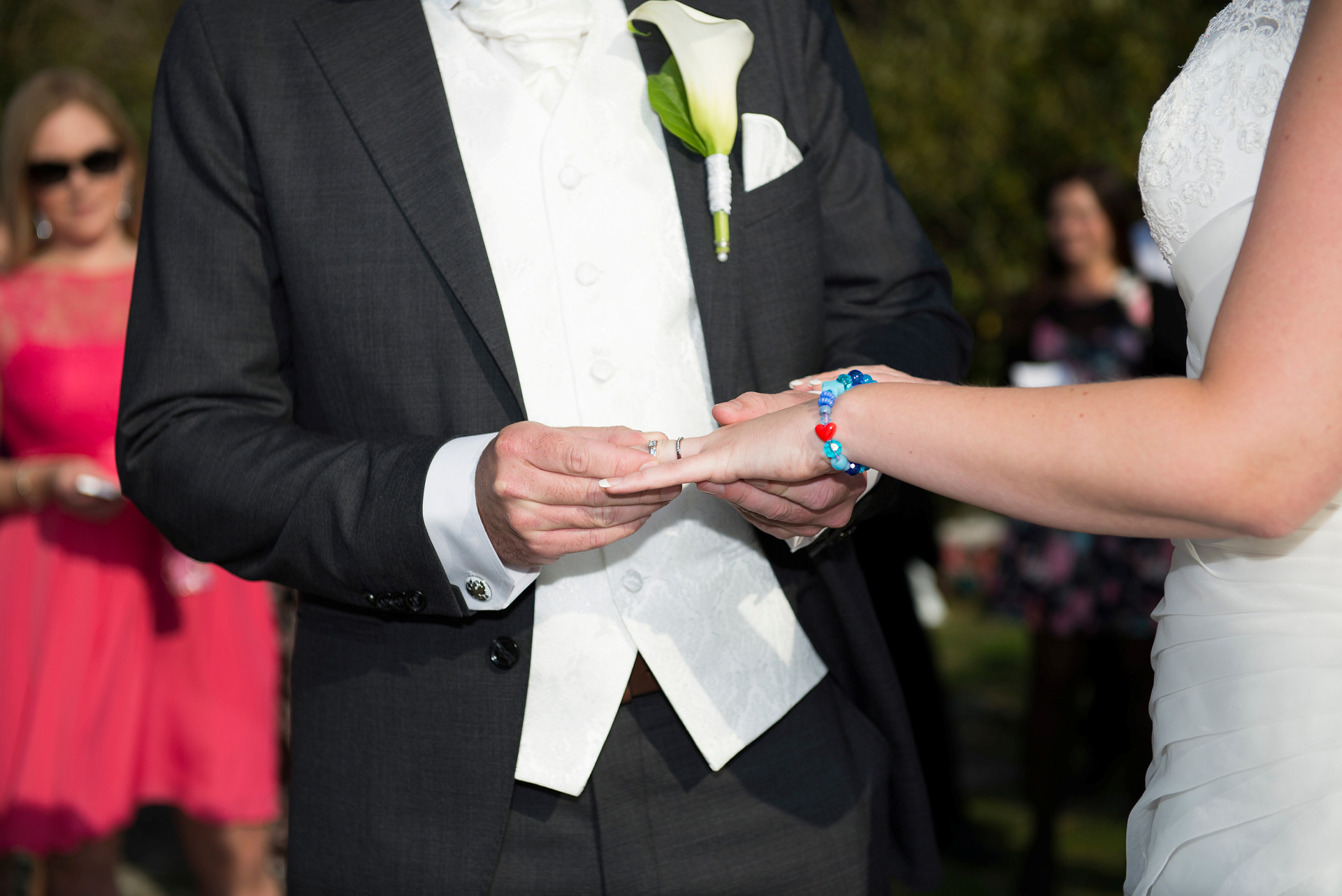 Ringarna som man sätter på varandras fingrar är det synliga tecknet på att man lovat att ställa upp på varandra varje dag. Ringen är evighetssymbolen. Guldet står för att man vill ge varandra det finaste och dyrbaraste. Att ringen sätts på vänster finger beror på att man förr trodde att det just från vänster ringfinger gick en nerv till hjärtat.