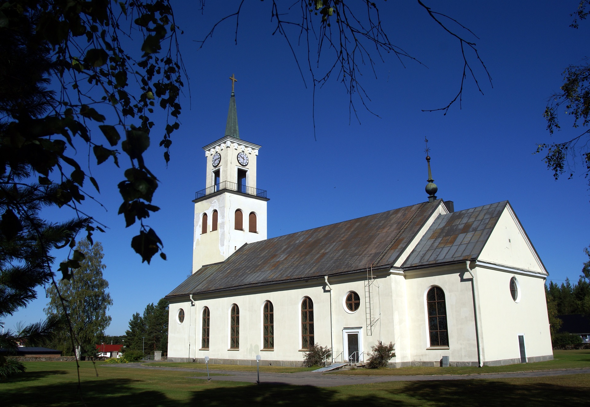 Sadeltaket är klätt med plåt, fasaderna är vitputsade.