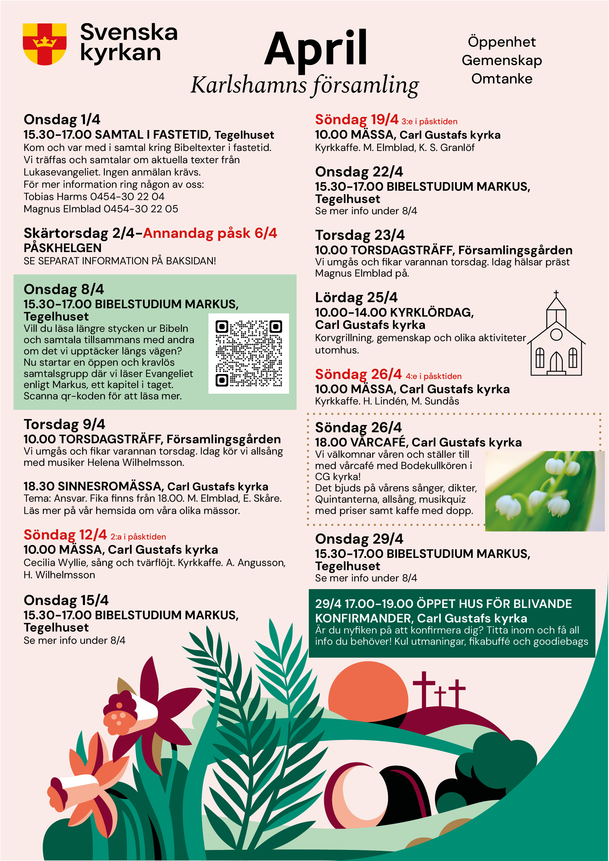 Här ser du allt som händer under april månad. Som vanligt är det många trevliga stunder som bjuds, bland annat gudstjänster, påskmusik, taizémässa, bibelstudium, konfadag, mötesplatser, konsert och kyrklördag. Välkomna!