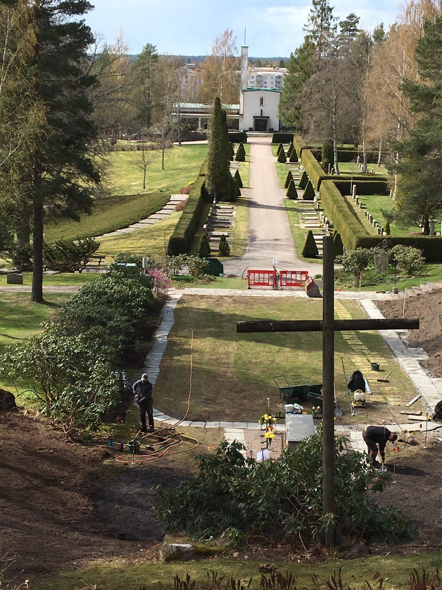 Arbetet i Södra minneslunden innebär att vi har lagt en dränering längs med ena långsidan av gräsmattan för att kunna avleda vatten som kommer från berget.