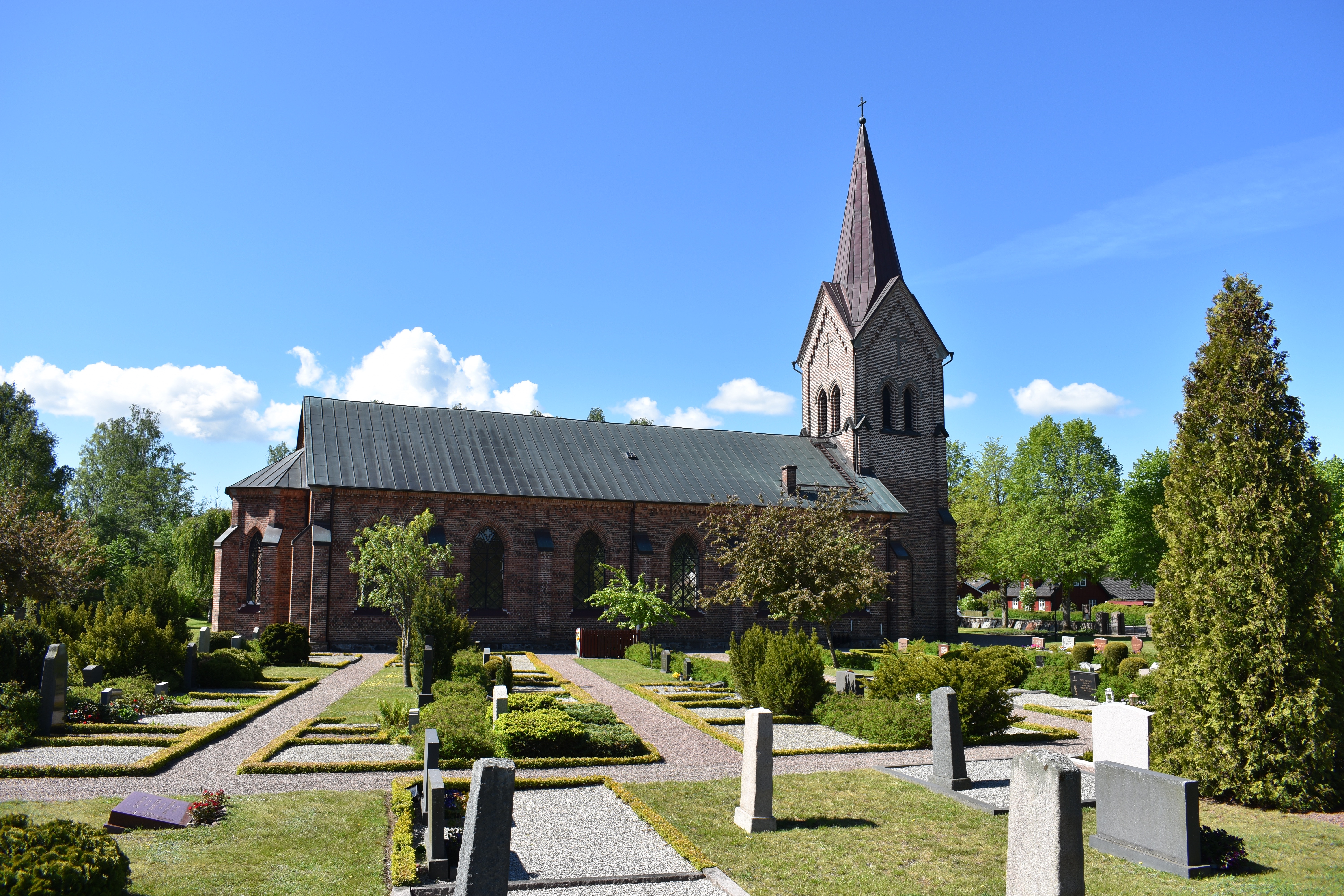 - är naturskönt belägen med angränsande sädesfält. Till höger om kyrkan, på den äldre delen, finns minneslund, urnlund och askgravplats.