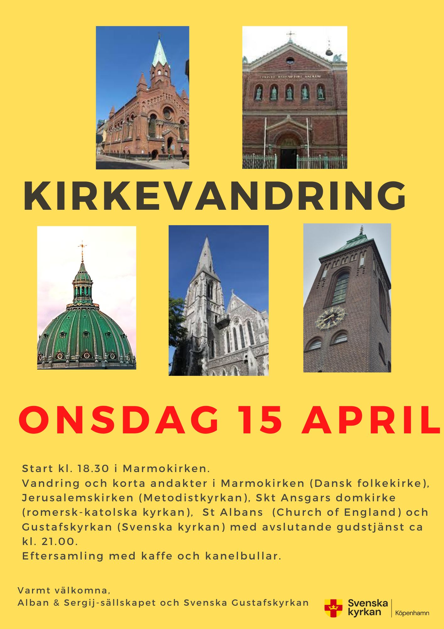 Efter den fælles indledning i MARMOKIRKEN (obs ny kirke) vandrer man rundt til kirkerne i fire hold, som samles til fælles afslutning i Gustafskyrkan.