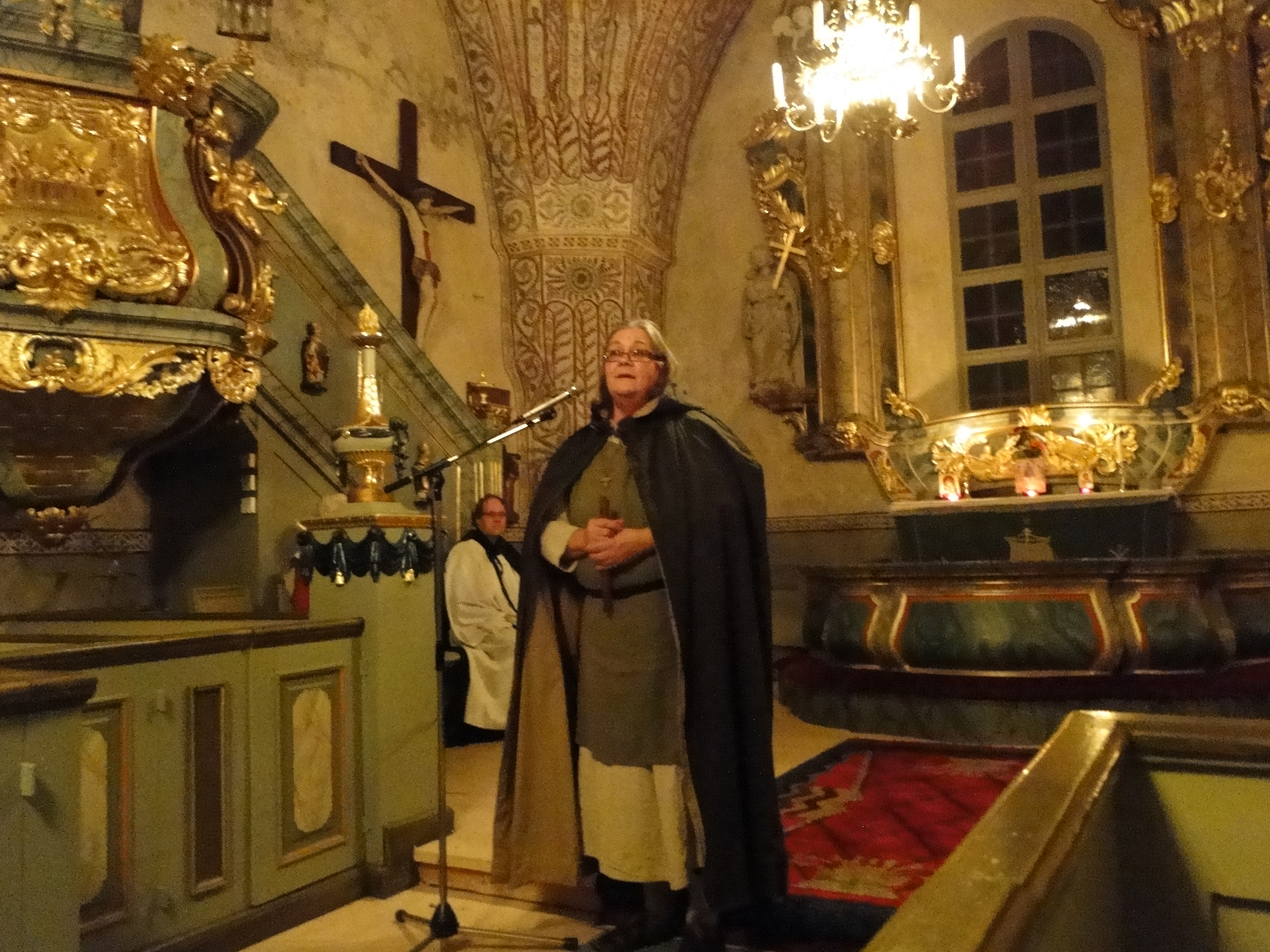 Genom musik, ljussättning, språk och klädsel får mässan en ton av medeltid, där fantasin hjälper oss att ana kyrkans ungdom.