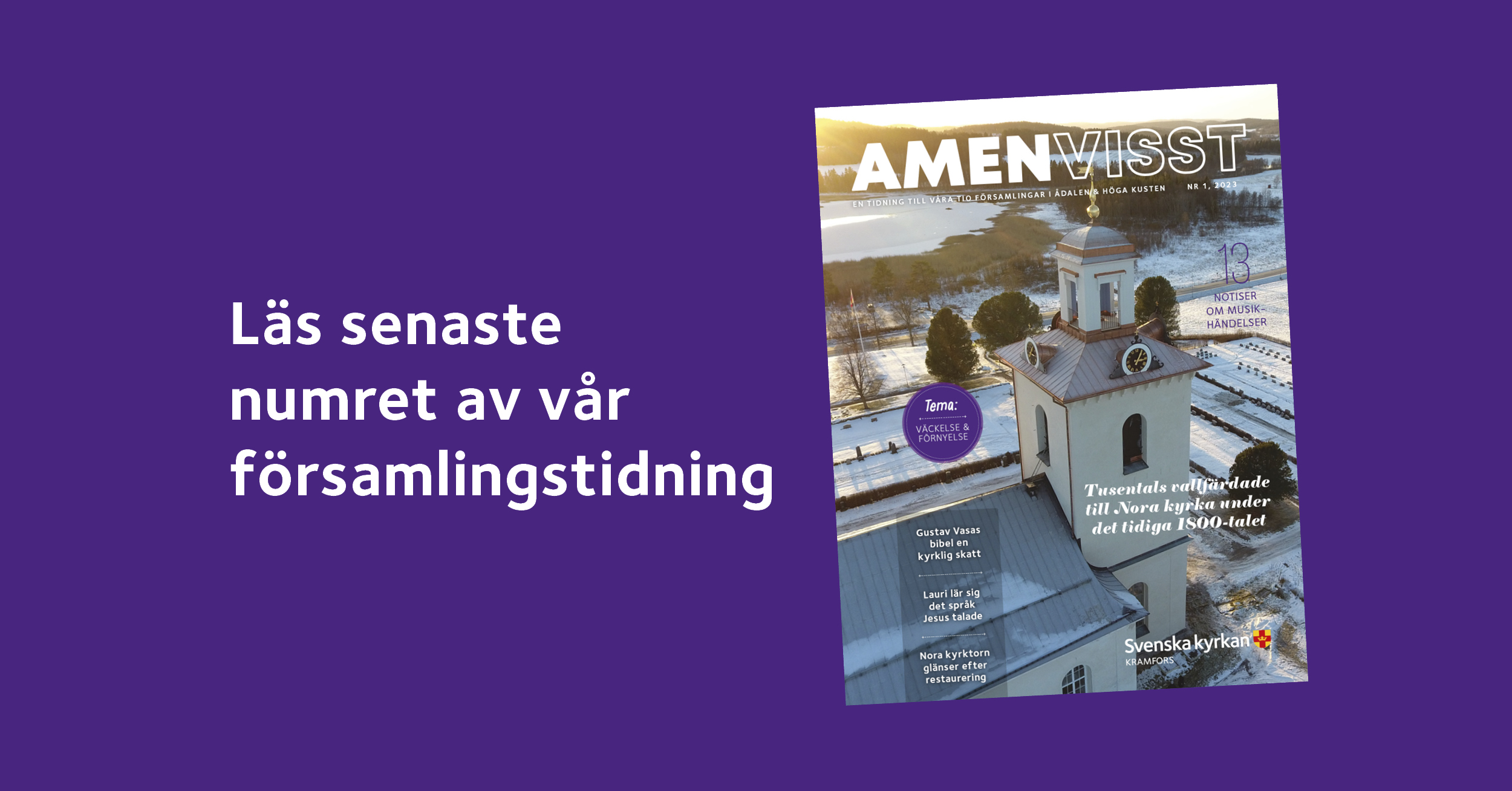 Vi hoppas numret bjuder givande läsning utifrån temat om väckelse & förnyelse. Nora kyrka får särskilt fokus då den var platsen för något riktigt spännande i början på 1800-talet. En historia att vara stolta över! Sen ger vi också en liten rapport om restaureringen av kyrkans torn som nu står klart och pryder tidningsomslaget så fint.