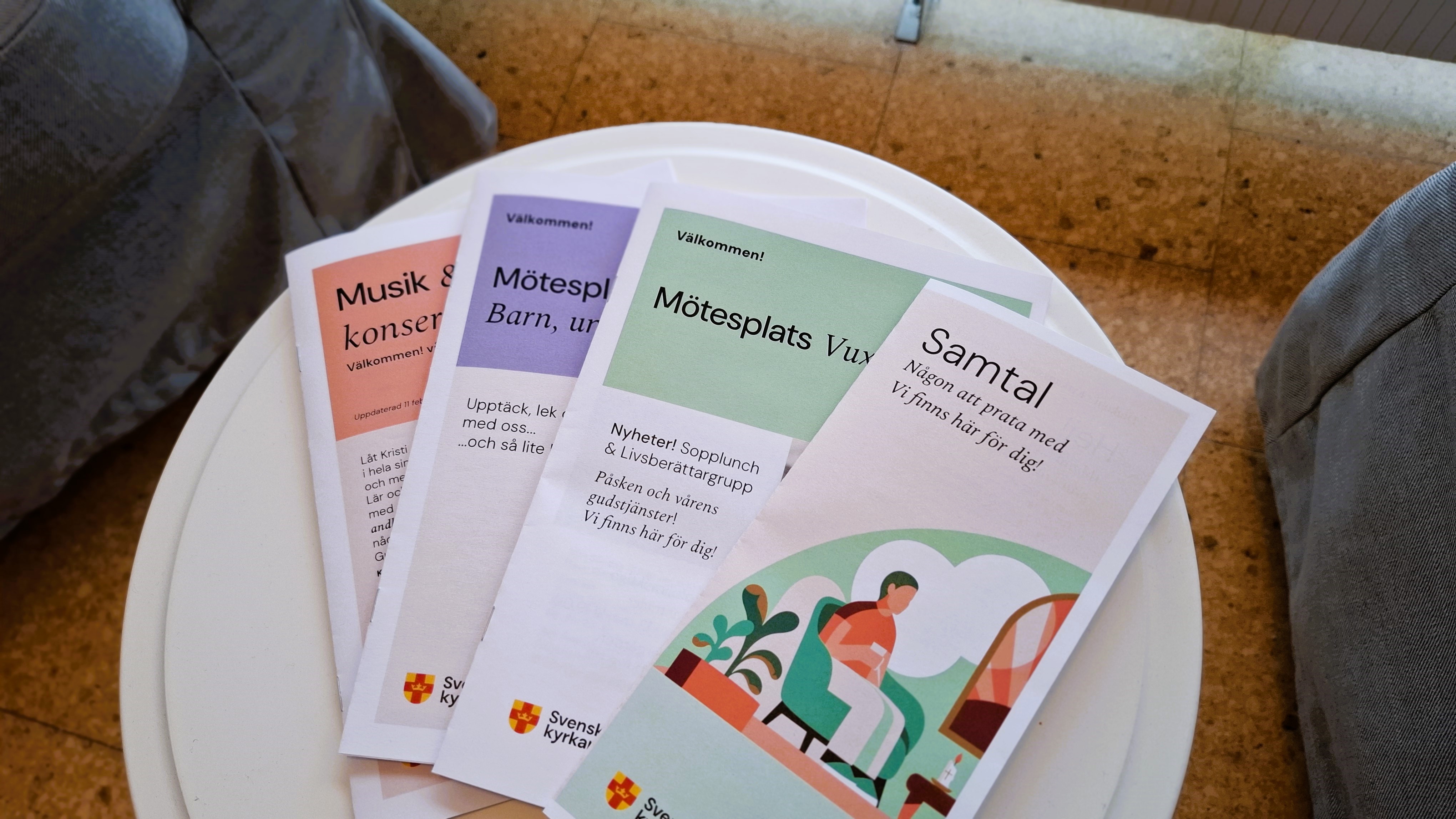 Nu finns foldrarna med information om våra verksamheter för våren 2026. Det är för "Mötesplats Barn, unga och familj", "Mötesplats Vuxen", uppdaterad folder om Musik och konserter samt en om Samtal- någon att prata med.