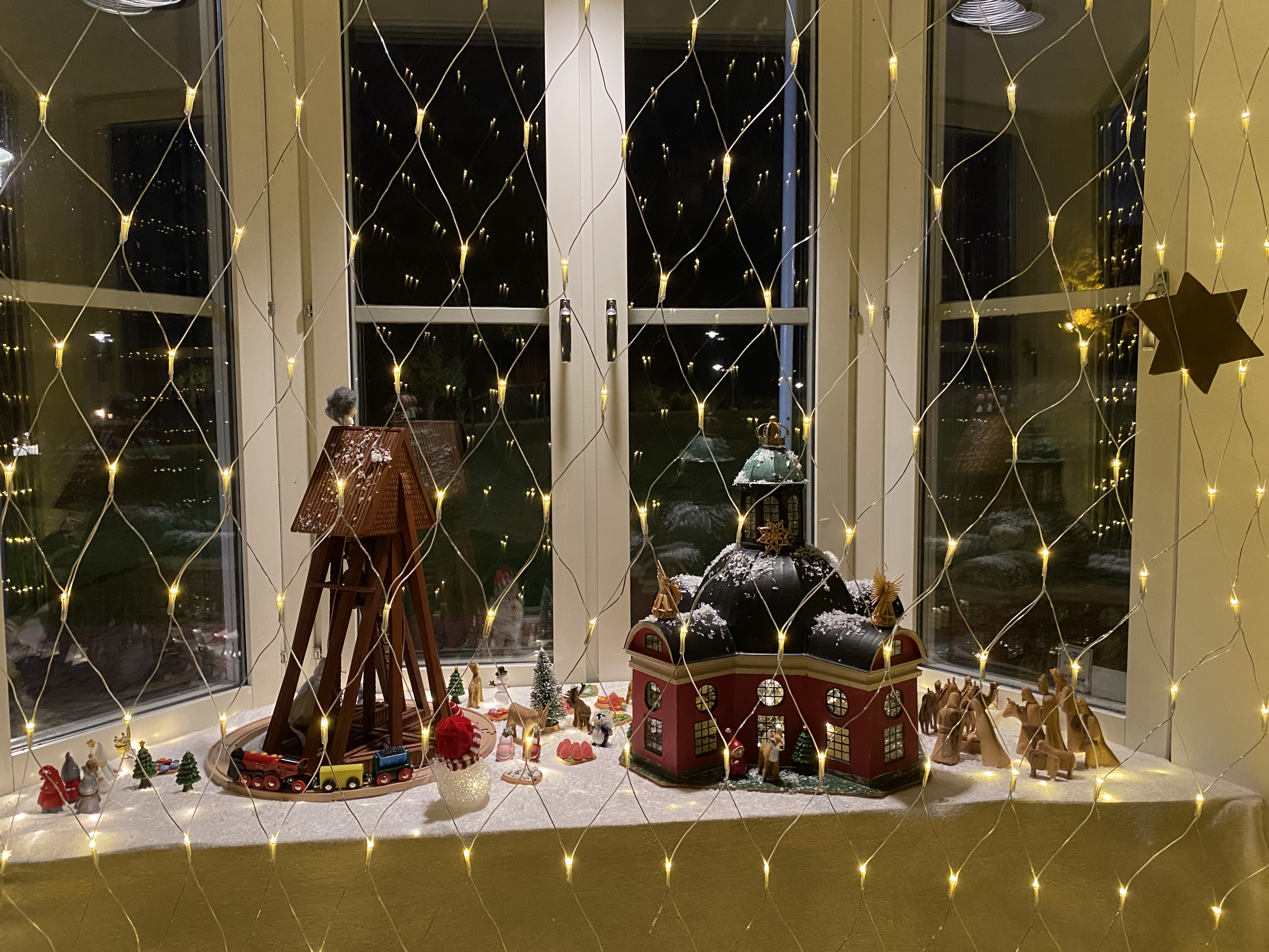 Nu kan du komma förbi Kristinagården och titta på när tåget åker runt vår fina klockstapeln. I år har barnen på After school dekorerat fönstret. Adventsfönstret är i stora salen mot klockstapeln.