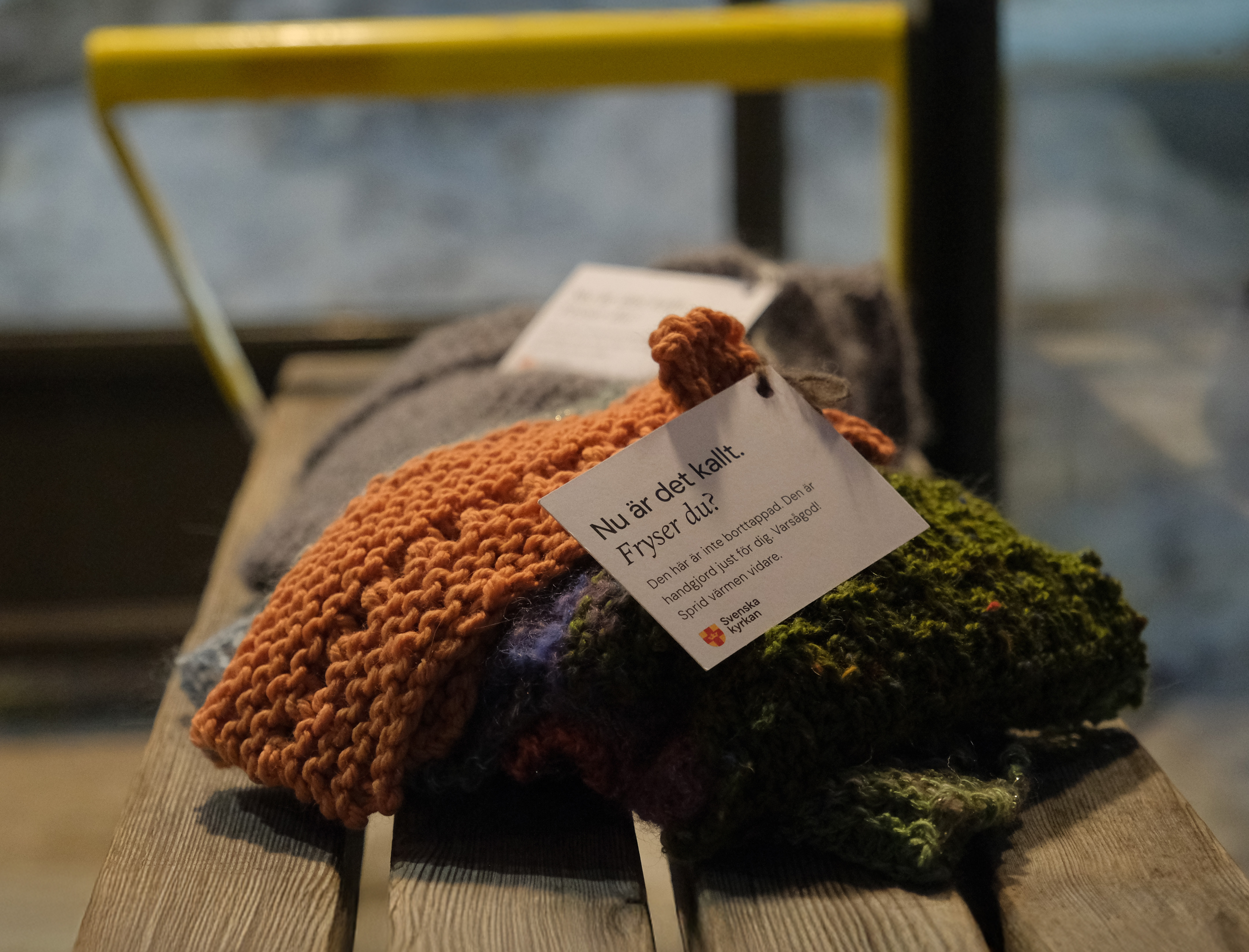 ”Nu är det kallt. Fryser du? Den här är inte borttappad. Den är handgjord just för dig. Varsågod! Sprid värmen vidare. Gör något snällt för någon annan. Tillsammans kan vi ta hand om varandra och bidra till att skapa #EttVarmareSamhalle.”
