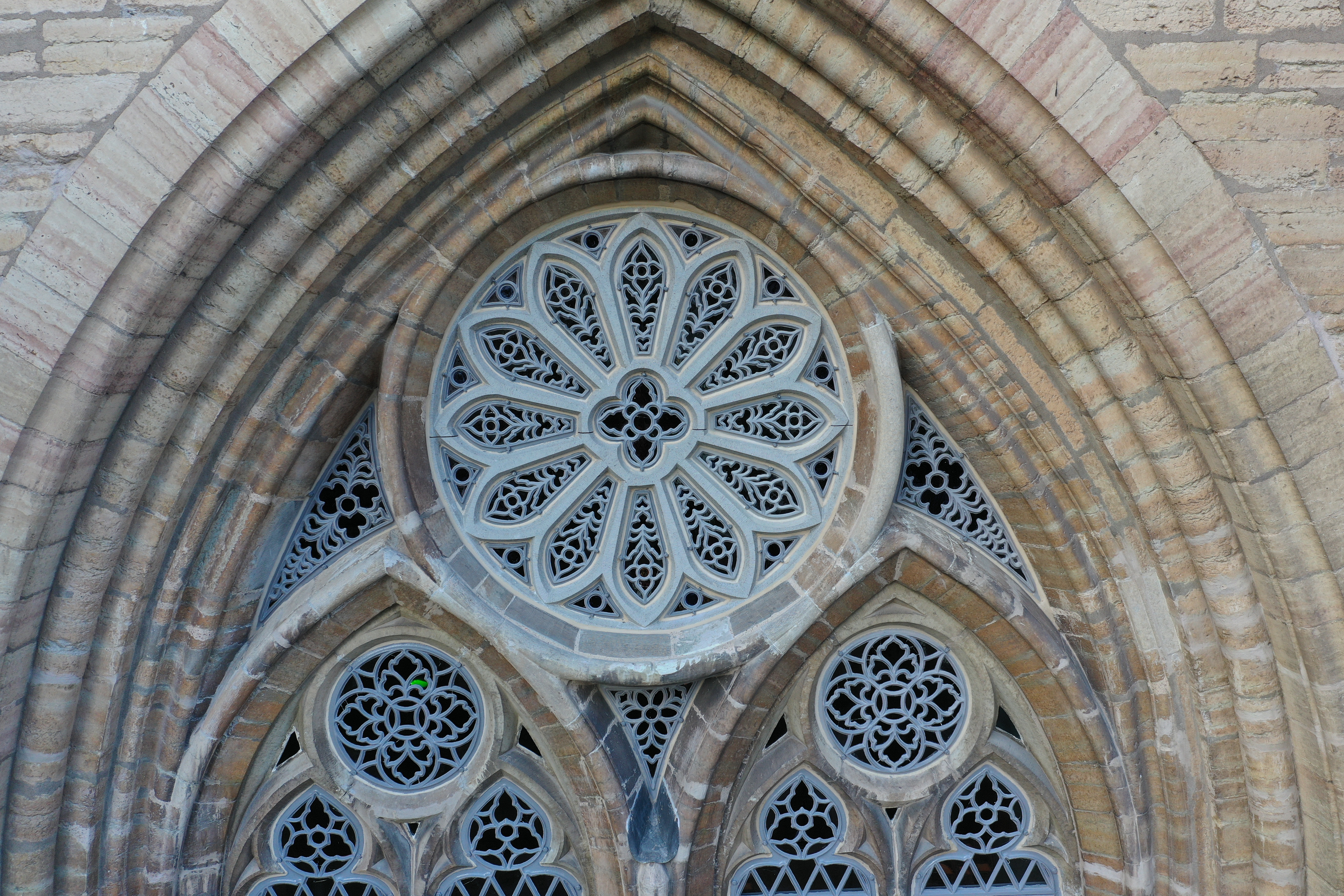 Det är stenstommen, det så kallade masverket, som har plockats ner från sin ursprungliga plats på södra långväggen i Domkyrkan. Det är det femte fönstret placerat öster om den stora södra porten. Stommen i kalksten tillverkades i ett stycke, vilket krävde skickliga stenhuggare. Den är naturligtvis märkt av tidens tand, men förvånansvärt väl bevarad.