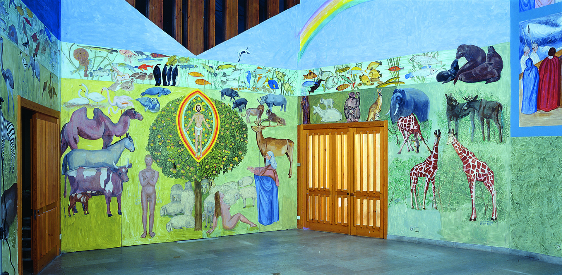 Sven Ljungberg började måla fondväggen framme vid koret. Där har han återgett sin bild av paradiset som det avbildas på Bibelns första blad. Över Kunskapens träd simmar fiskar och under trädet befinner sig Adam och Eva samt en grupp vilande får. Kristus finns i Kunskapens träd och har fått en gloria av äkta guld. Sven fortsatte sedan, med korets sidor, att måla djur från alla världsdelar.